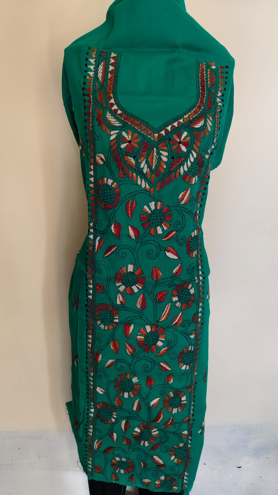 Green Cotton Kantha Handwork Kurta Material – Handcrafted Floral