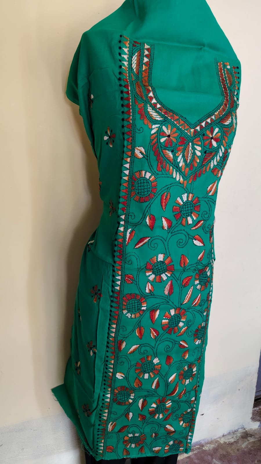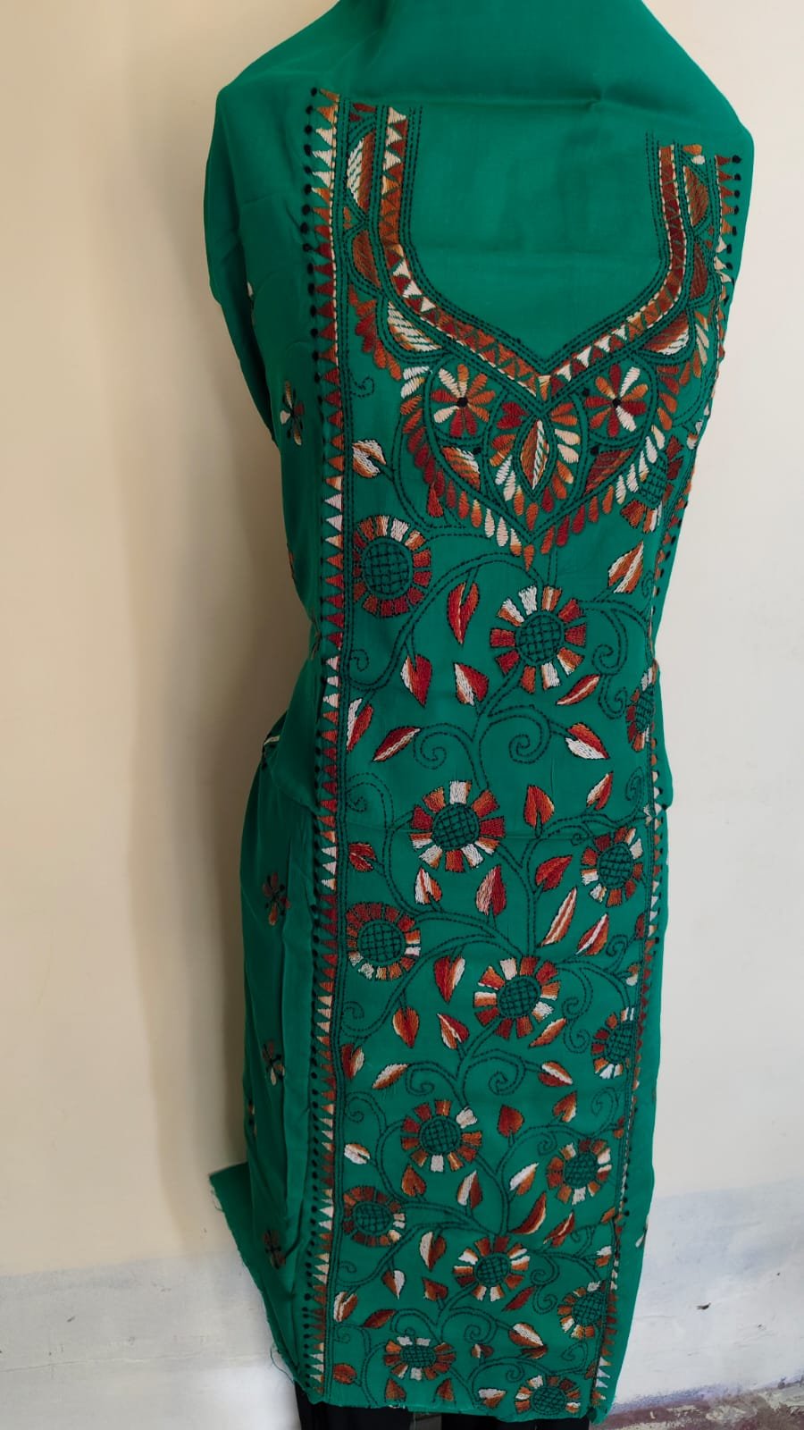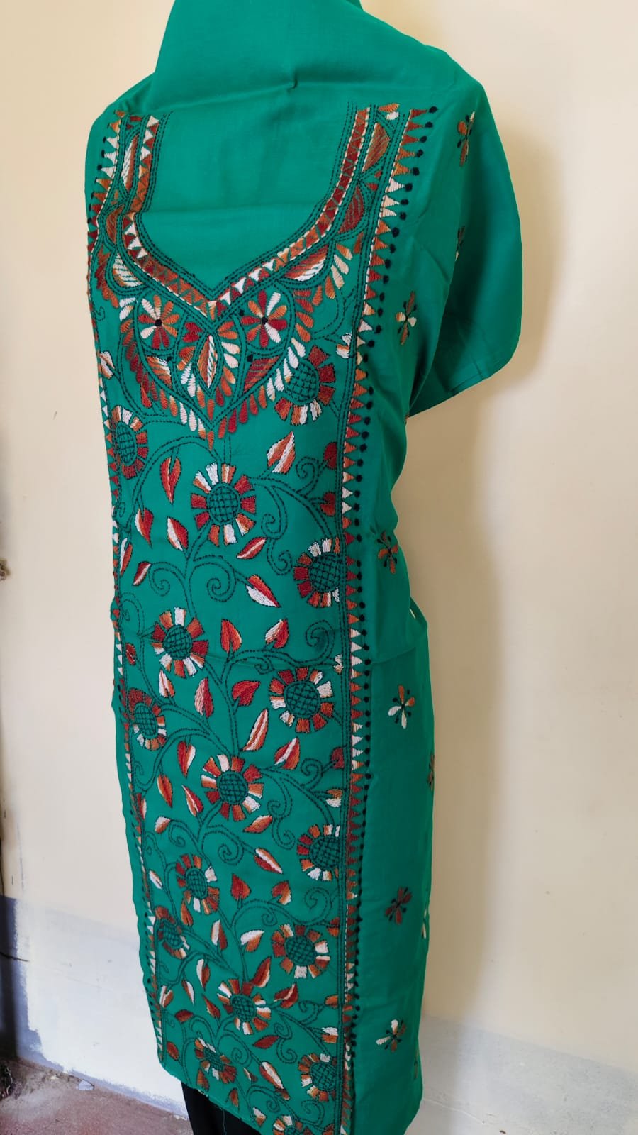 Green Cotton Kantha Kurti Material – Handcrafted Floral Multicolor