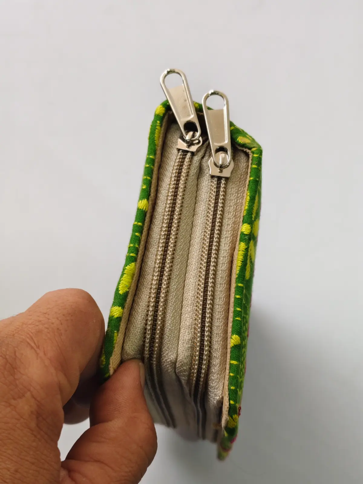 Green Kantha Stitch Cotton Zip Wallet β Double Zipper Compartments