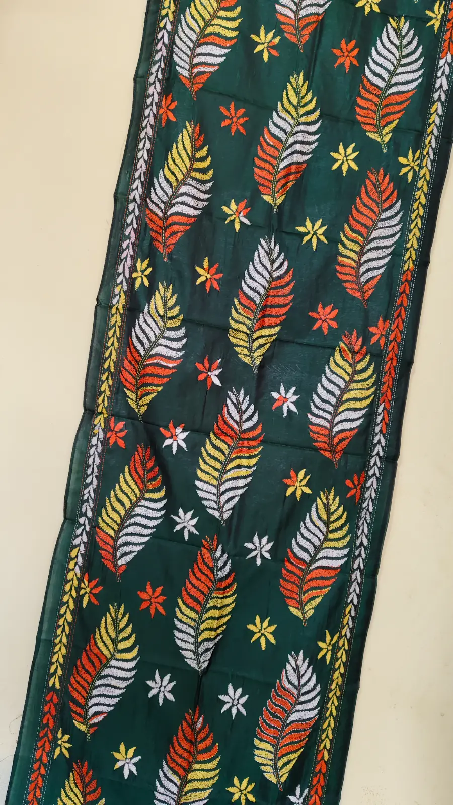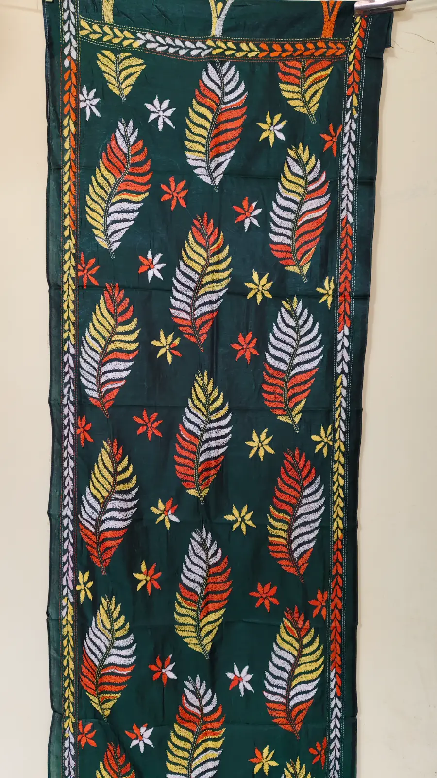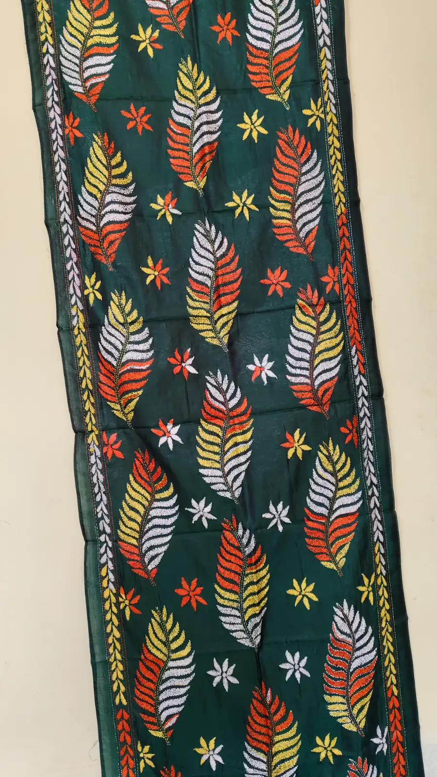 Elevate your style with this stunning handcrafted stole, crafted from premium green silk and adorned with traditional Kantha stitch embroidery. The yellow, orange, white, leaf motifs are beautifully accented, creating a timeless look. Suitable for both casual and festive wear, this light and soft stole adds a touch of traditional charm to any outfit.