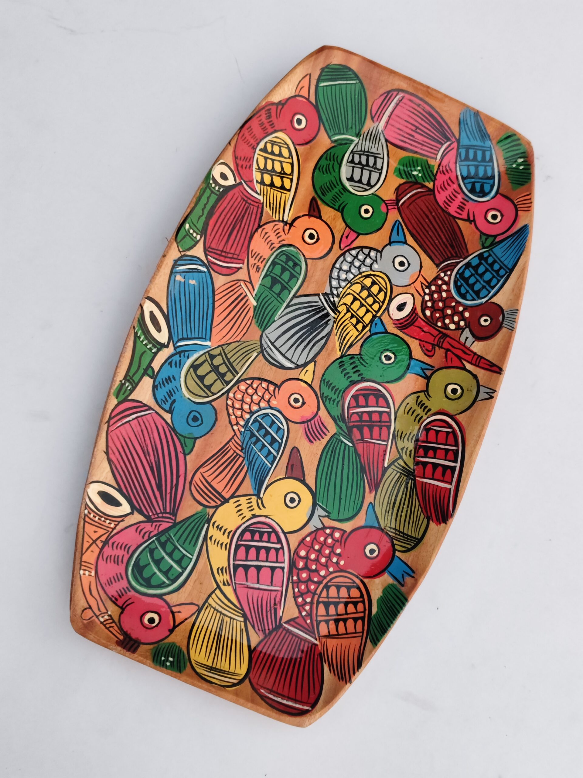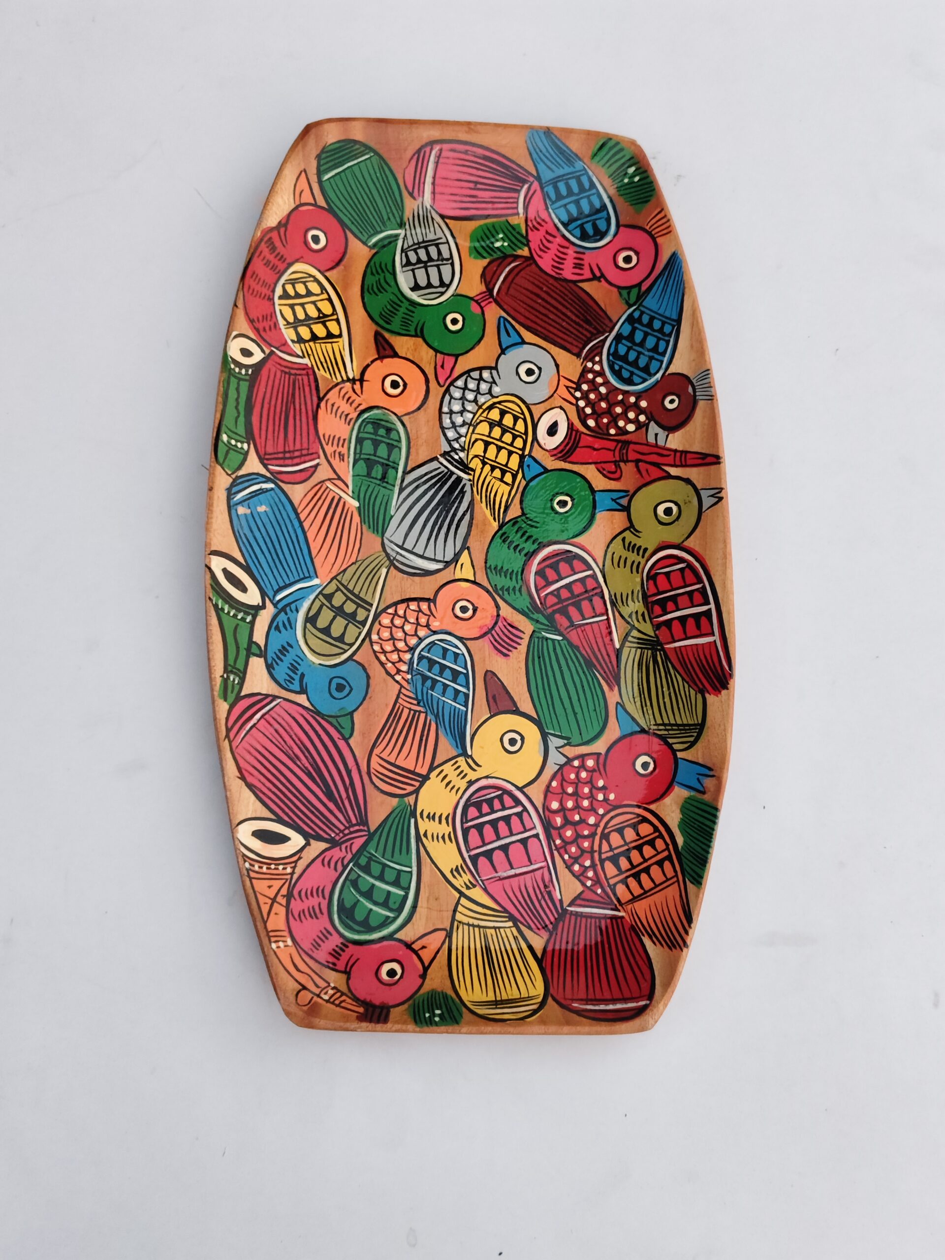 This tray is crafted from solid natural wood and beautifully hand-painted with vibrant folk-style bird motifs in multiple colors. The warm wooden base enhances the rich shades of red, green, blue, yellow, and black, creating a lively and eye-catching design. With a smooth polished surface and gently curved edges, it is perfect for serving tea, snacks, or as a decorative display piece. Lightweight yet durable, it adds a cheerful and artistic touch to any space. Each tray is uniquely handcrafted, ensuring every piece is one-of-a-kind. Clean with a dry or slightly damp cloth and avoid prolonged exposure to water.