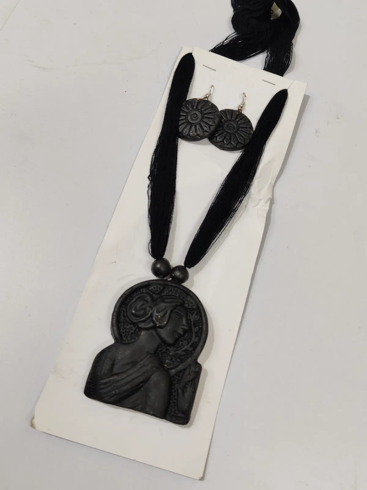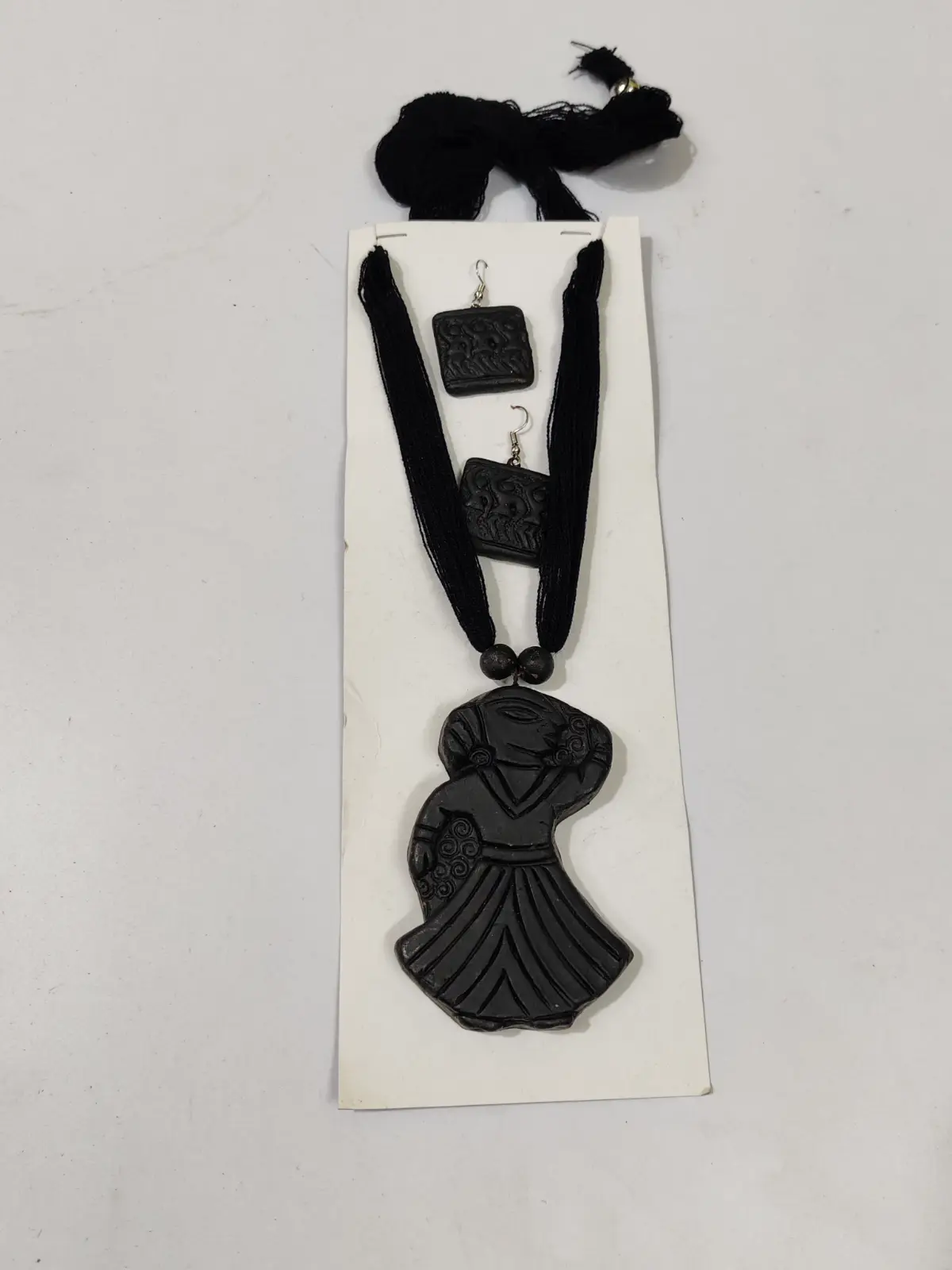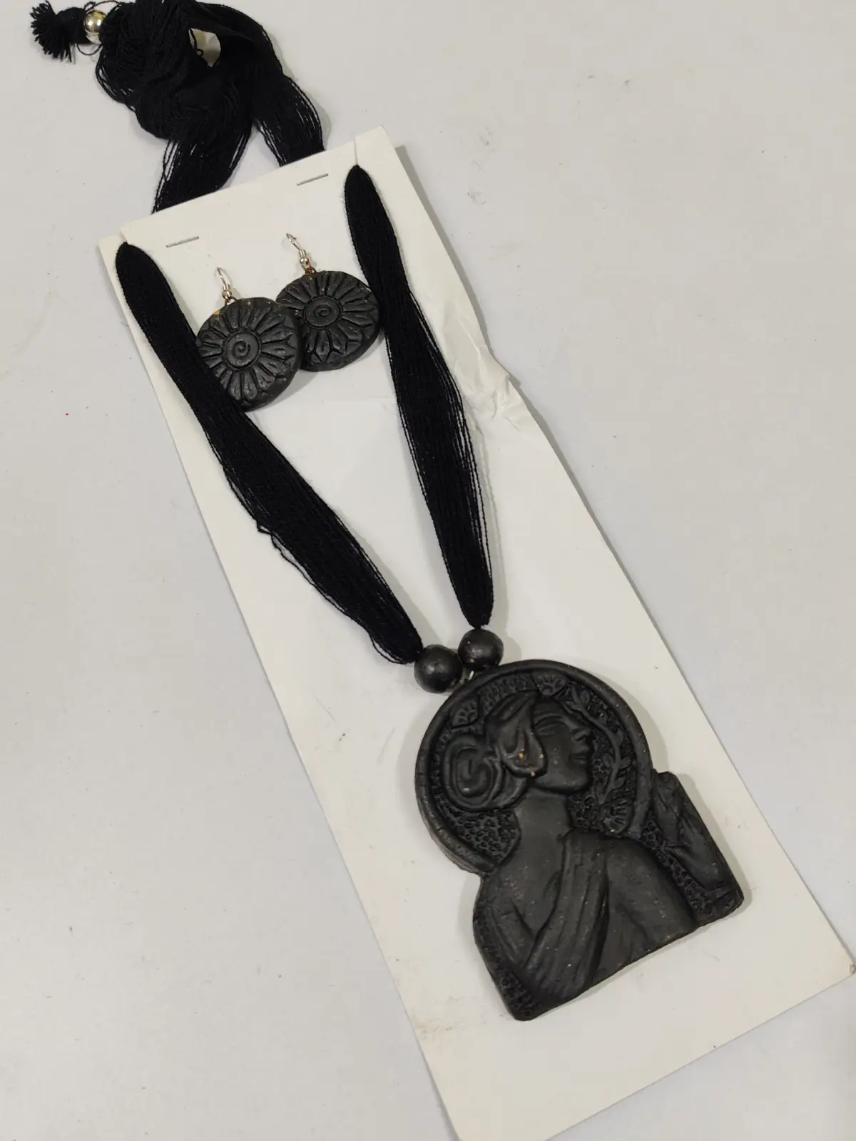 This necklace features terracotta craftsmanship. A black, handcrafted terracotta necklace set for women (Quantity: 1 set).