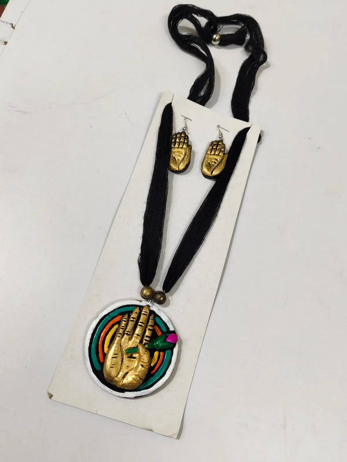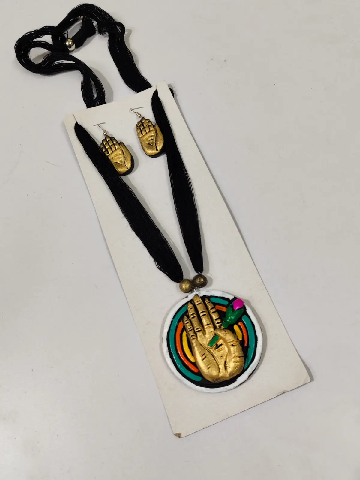 This unique jewellery set is handcrafted from traditional terracotta, showcasing beautiful artisan craftsmanship. The set features a striking round pendant with a hand motif design highlighted with vibrant colors, paired with a black cord necklace that enhances its bold artistic appeal. Matching terracotta earrings with the same hand-inspired design complete the set, creating a coordinated ethnic look. Lightweight and comfortable to wear, this jewellery set pairs beautifully with sarees, kurtas, and ethnic outfits for cultural events or casual occasions. Each piece is handmade by skilled artisans, making every set slightly unique.