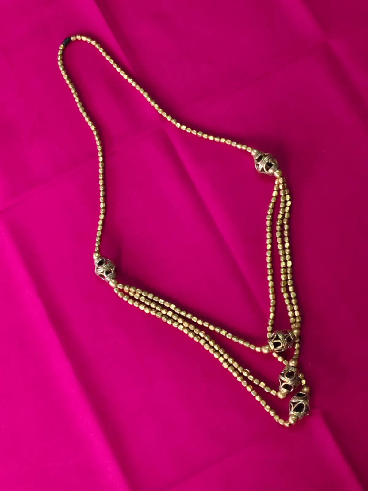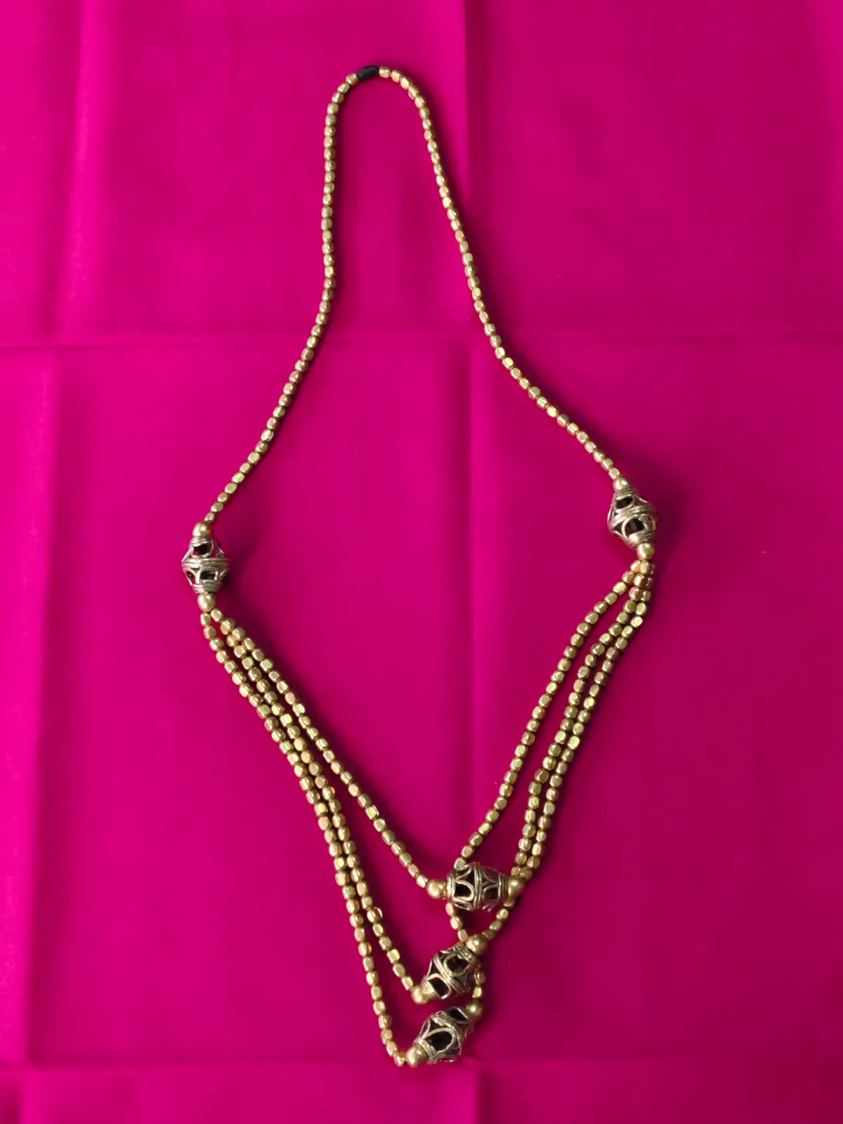 This elegant handcrafted necklace features a beautiful arrangement of polished brass beads, styled in a classic triple-layer pattern. Each strand is adorned with intricately carved tribal-style brass globes that add richness and character to the design. The warm golden tone pairs effortlessly with both traditional and contemporary outfits, making it perfect for festive wear, events, or statement styling. Lightweight and artisan-made, this necklace carries a touch of heritage craftsmanship and refined ethnic charm. Keep away from moisture and store in a dry pouch to maintain its shine.