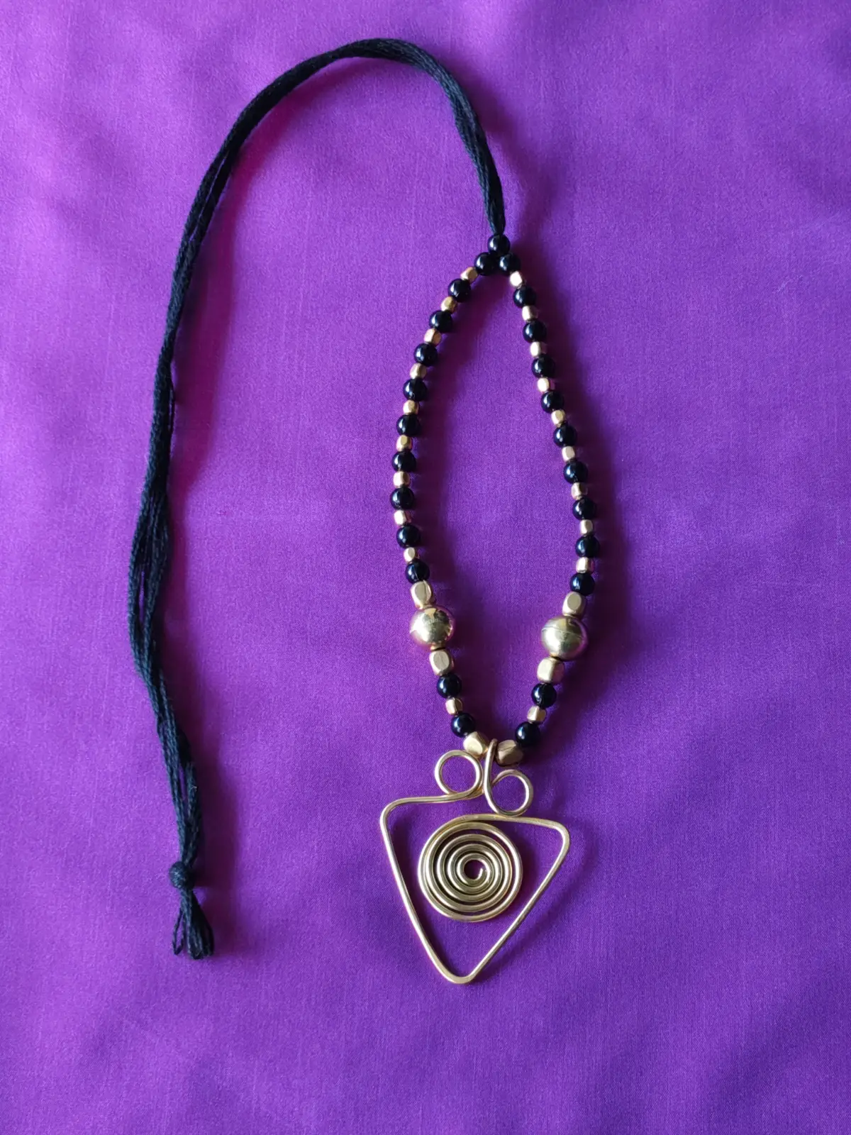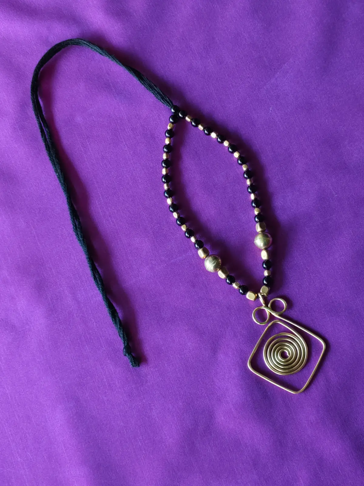 Description: Handmade brass spiral pendant on black thread made with black and gold beads. And perfect with a saree or kurti. Nickel-free finish; minor variations reflect craftsmanship.