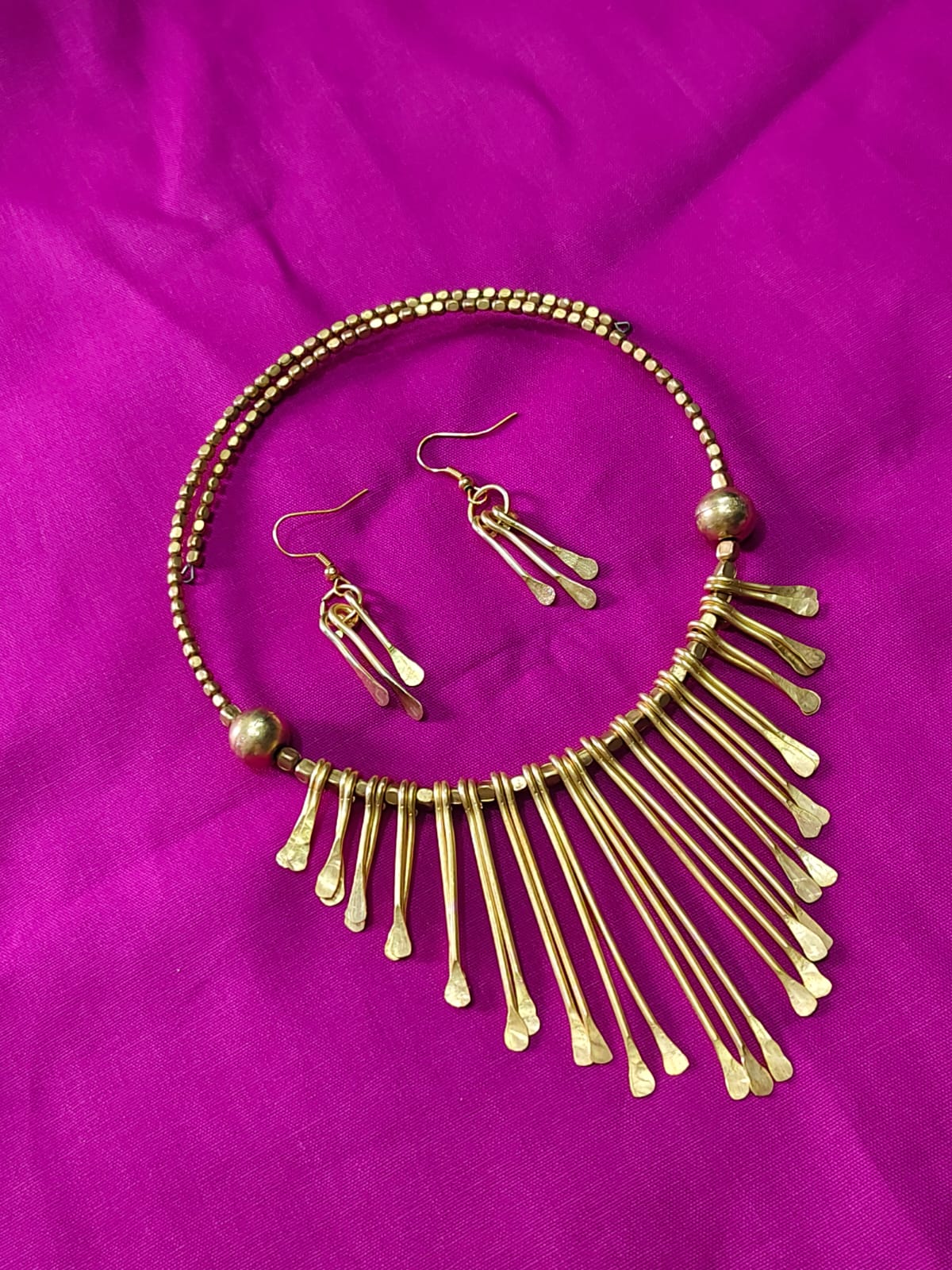 Make a bold statement with this handcrafted brass jewelry set, featuring a beaded neck wire and a dramatic hammered fringe that shimmers with every move. The matching drop earrings complete the look for festivals, weddings, and contemporary ethnic styling.