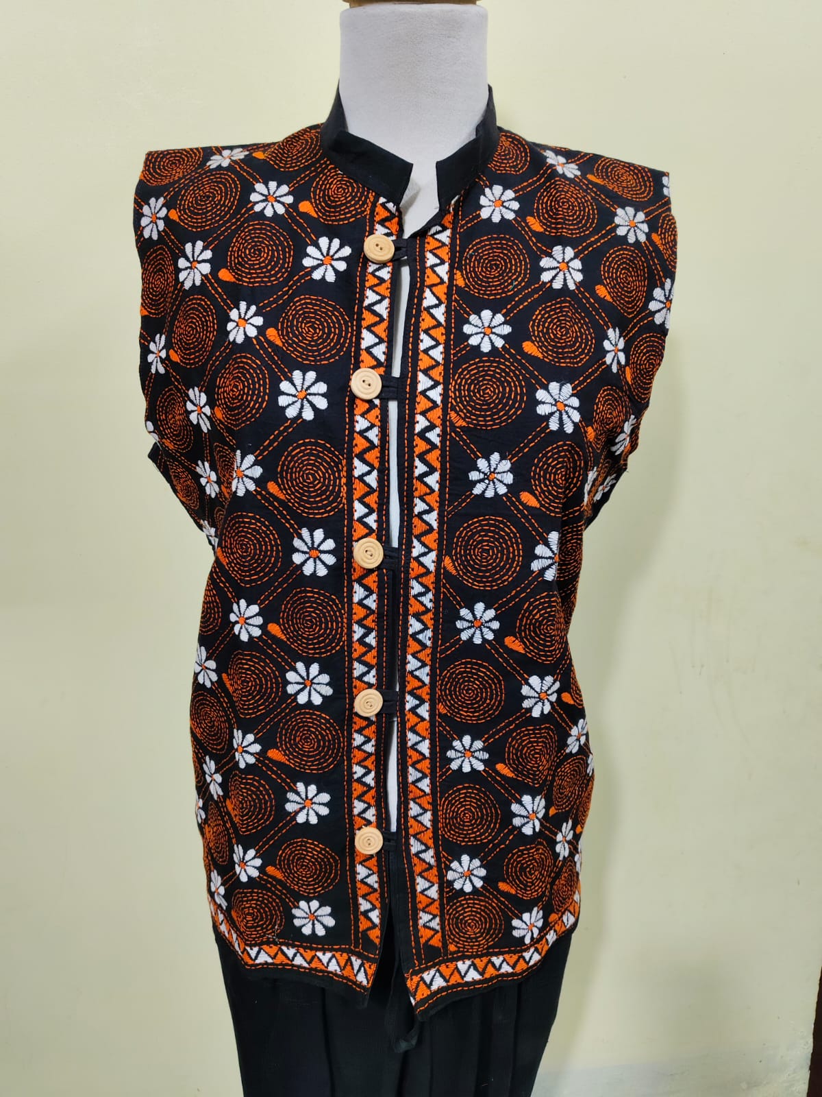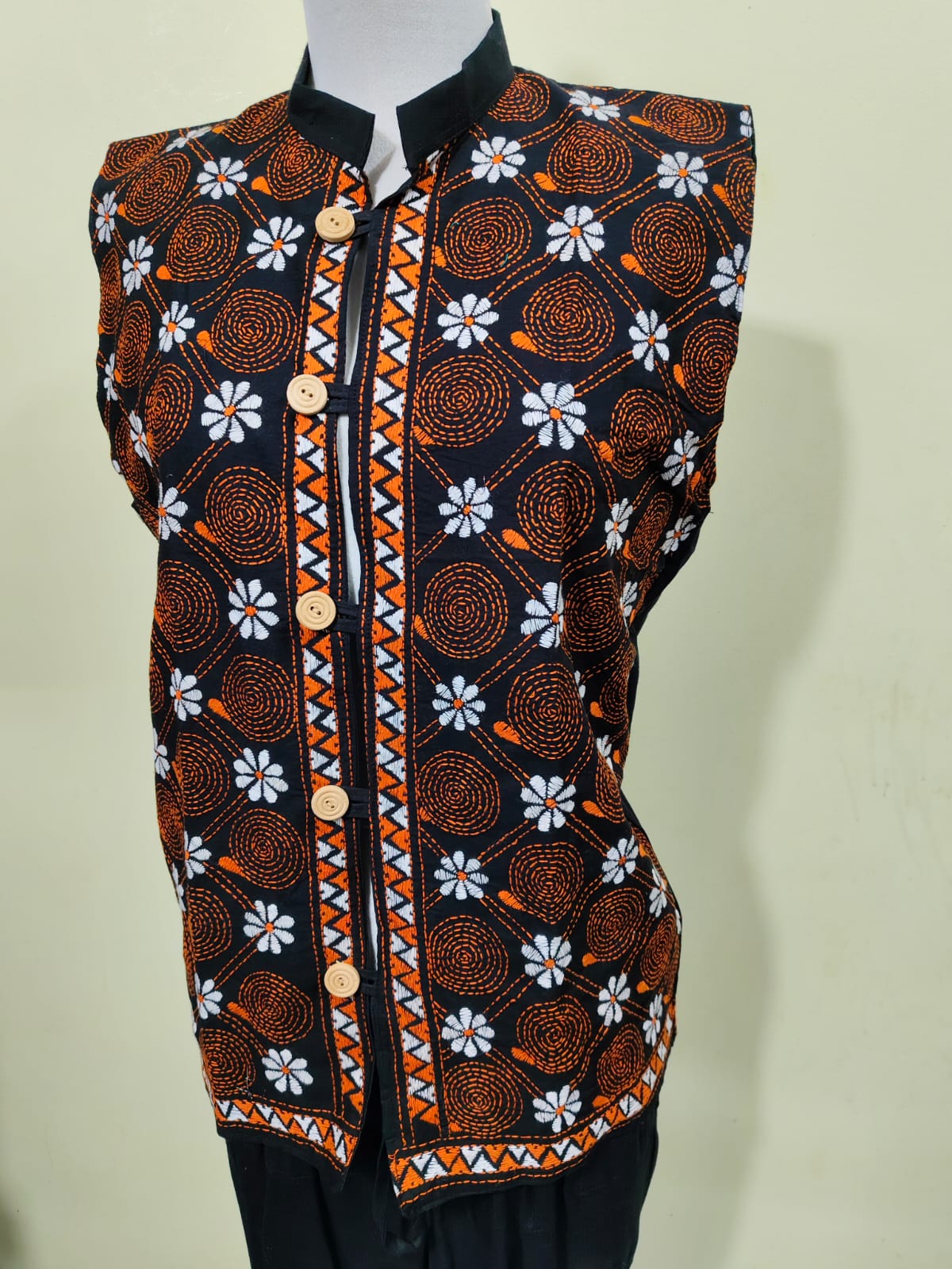 A handcrafted sleeveless jacket made from pure cotton with traditional Kantha stitch embroidery in multicolor threads. The design features vibrant geometric and leaf motifs on a black base, finished with natural wooden buttons for a rustic appeal.
