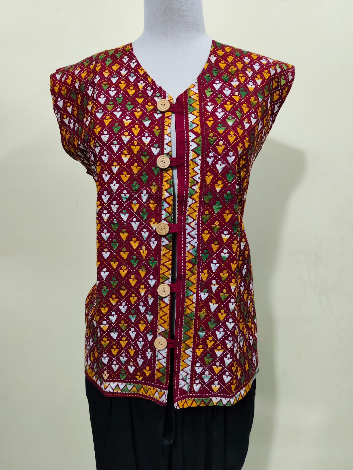 Handcrafted Cotton Kantha Stitch Sleeveless Jacket – Maroon