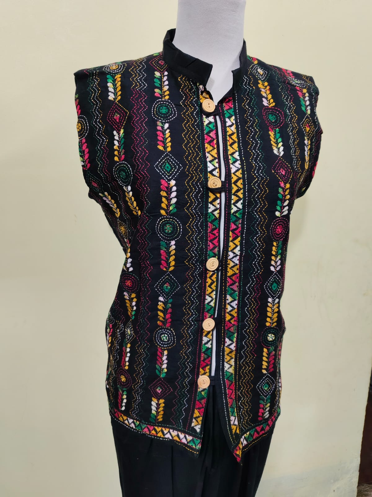 A handcrafted sleeveless jacket made from pure cotton with traditional Kantha stitch embroidery in multicolor threads. The design features vibrant geometric and leaf motifs on a black base, finished with natural wooden buttons for a rustic appeal.