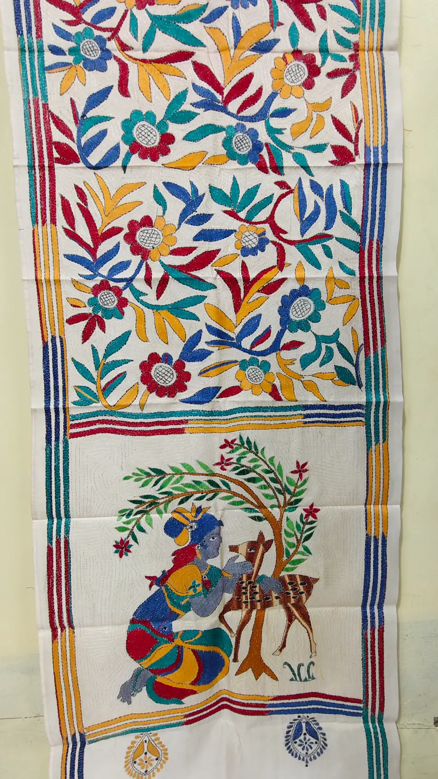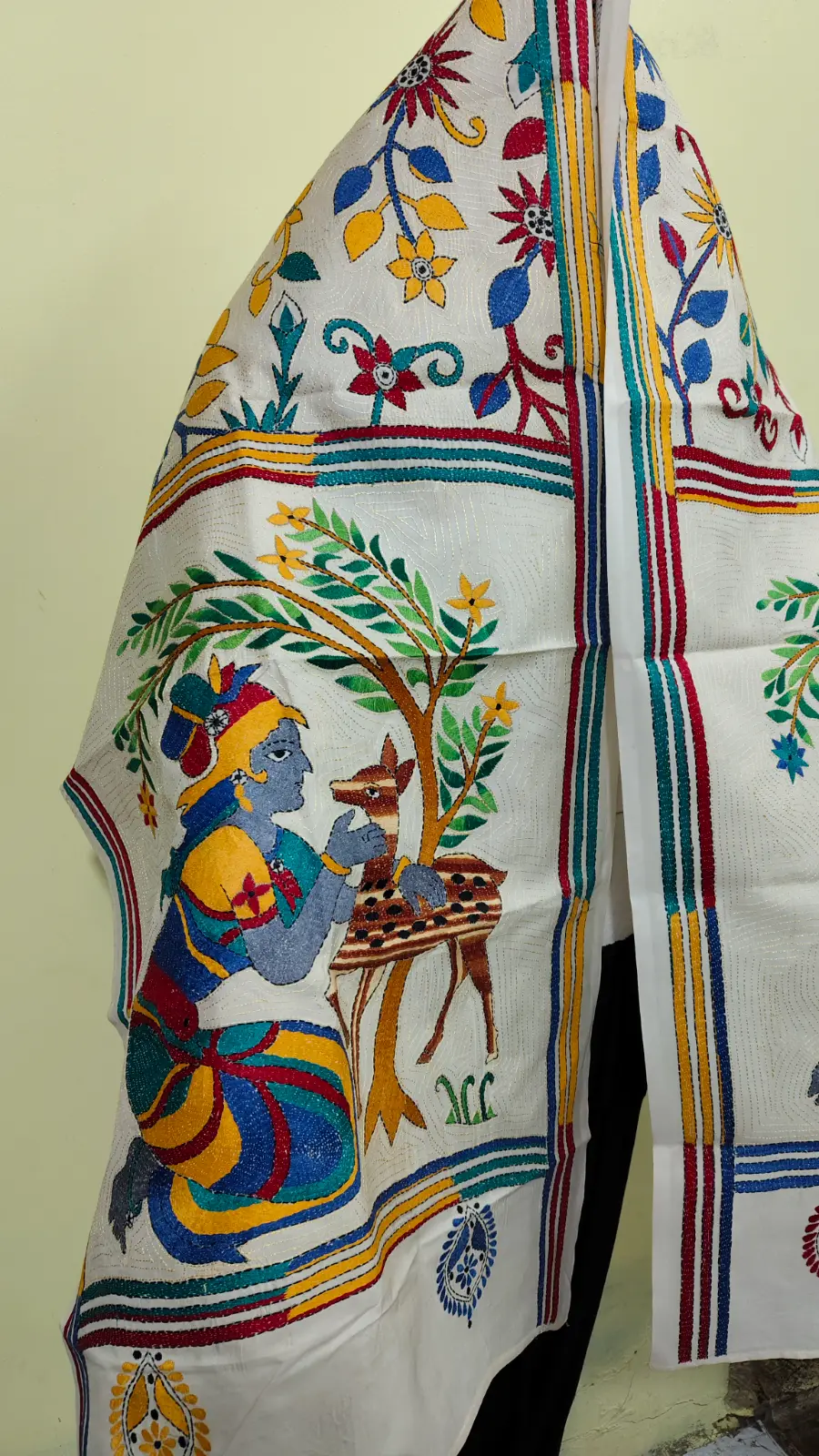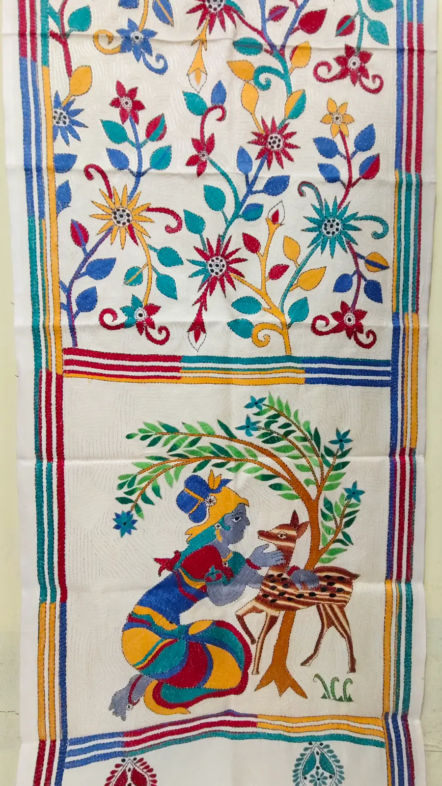 Handcrafted D Tussar Silk Kantha Stole – Multicolor Floral Embroidery on Cream Base