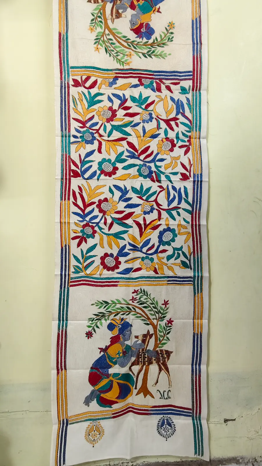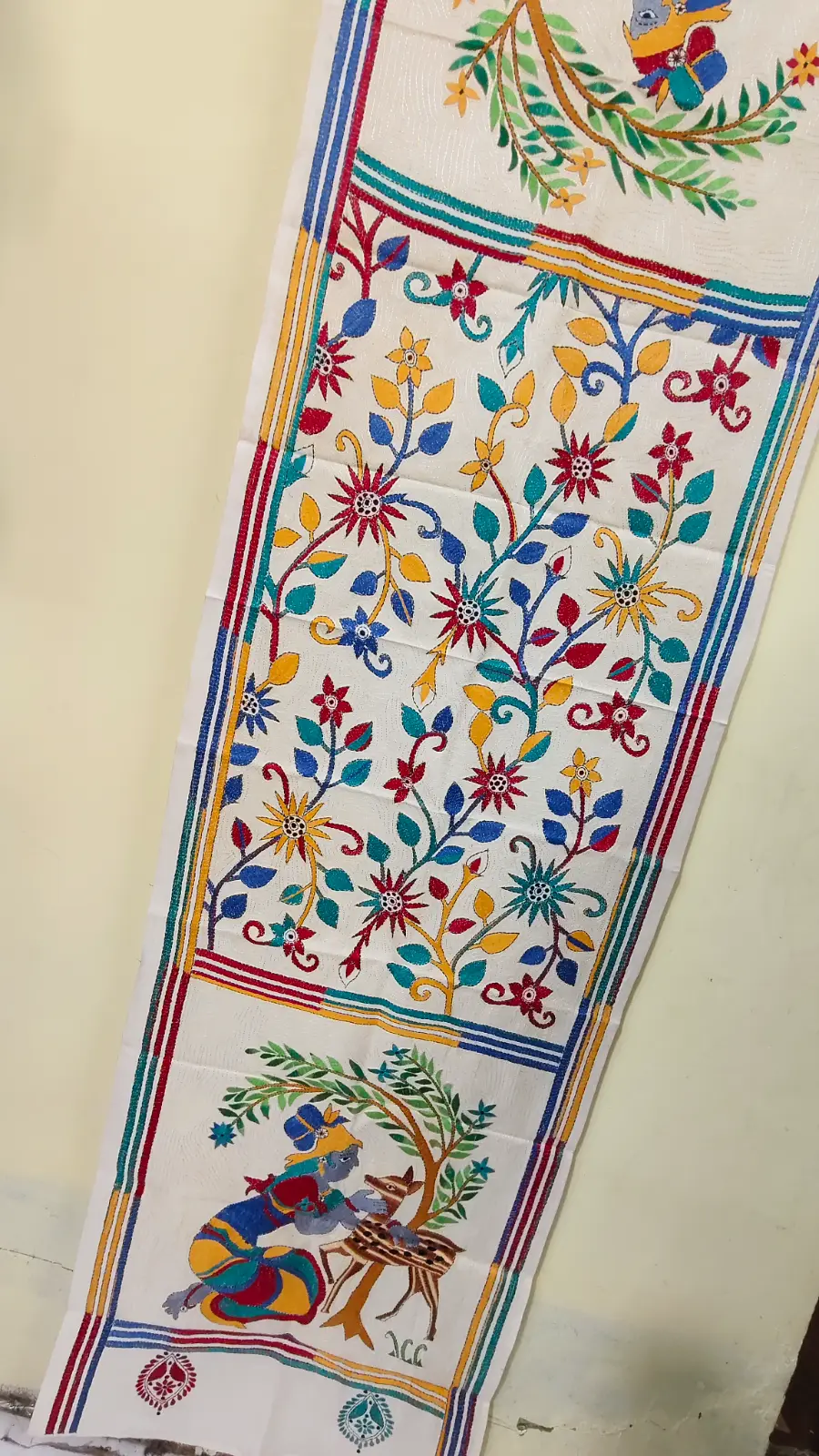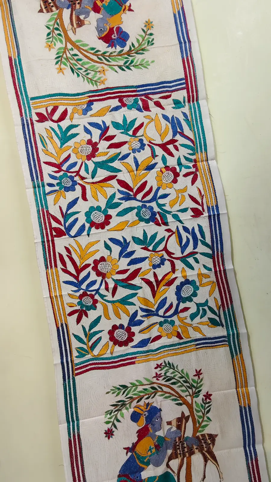Handcrafted D Tussar Silk Kantha Stole – Multicolor Floral Embroidery on Cream Base