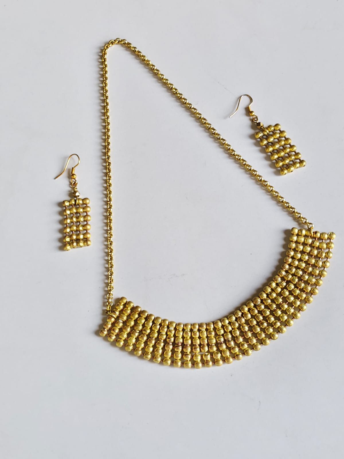 Made using traditional Dokra brass craft, this necklace set features multiple rows of hand-shaped beads arranged in a graceful curved pattern.