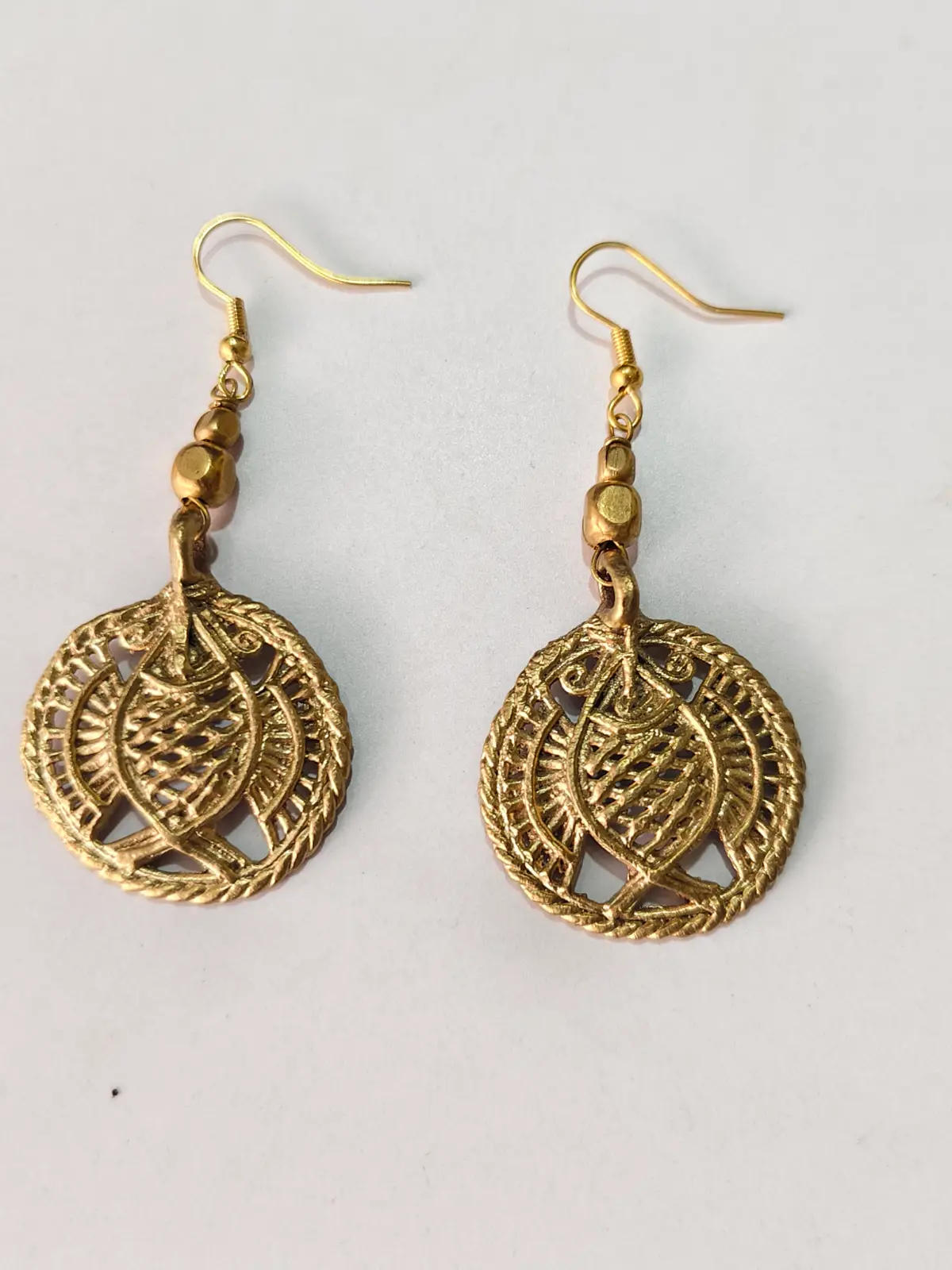 These handcrafted Dokra brass earrings showcase the rich heritage of tribal artistry from India. The circular motif features intricate hand-cast detailing, giving it a unique and rustic charm. Lightweight and comfortable to wear, these earrings add an elegant ethnic touch to both festive and everyday outfits. Each piece is made by skilled artisans using the traditional lost-wax casting technique, making every pair truly one-of-a-kind. A perfect accessory for those who love cultural craftsmanship and timeless jewelry.