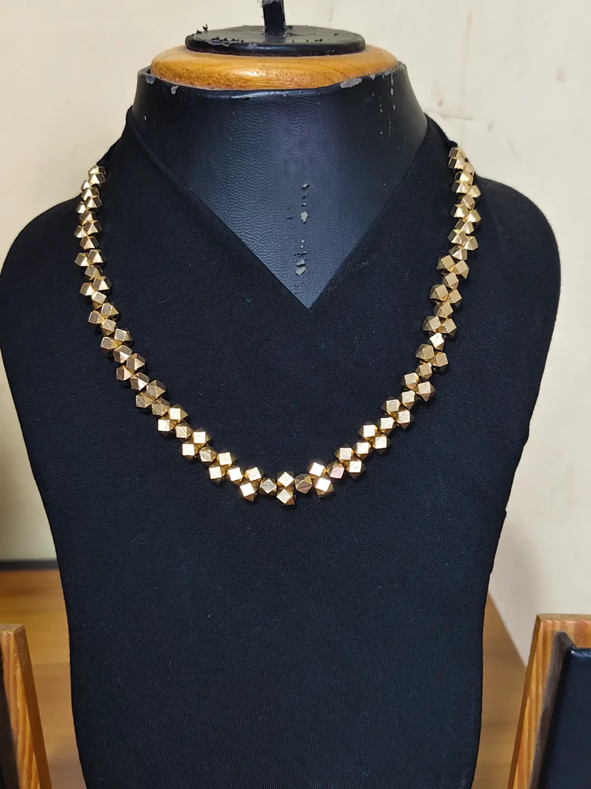 This handcrafted Dokra brass chain necklace beautifully represents the traditional tribal art of India. Designed with small geometric handcrafted beads, the necklace carries a rustic golden finish that adds a subtle yet stylish charm. Lightweight and comfortable to wear, it pairs effortlessly with both ethnic and contemporary outfits. Each piece is made through the ancient lost-wax casting technique by skilled tribal artisans, making every necklace uniquely crafted and full of cultural heritage. A perfect accessory for festive occasions, casual styling, or thoughtful gifting.