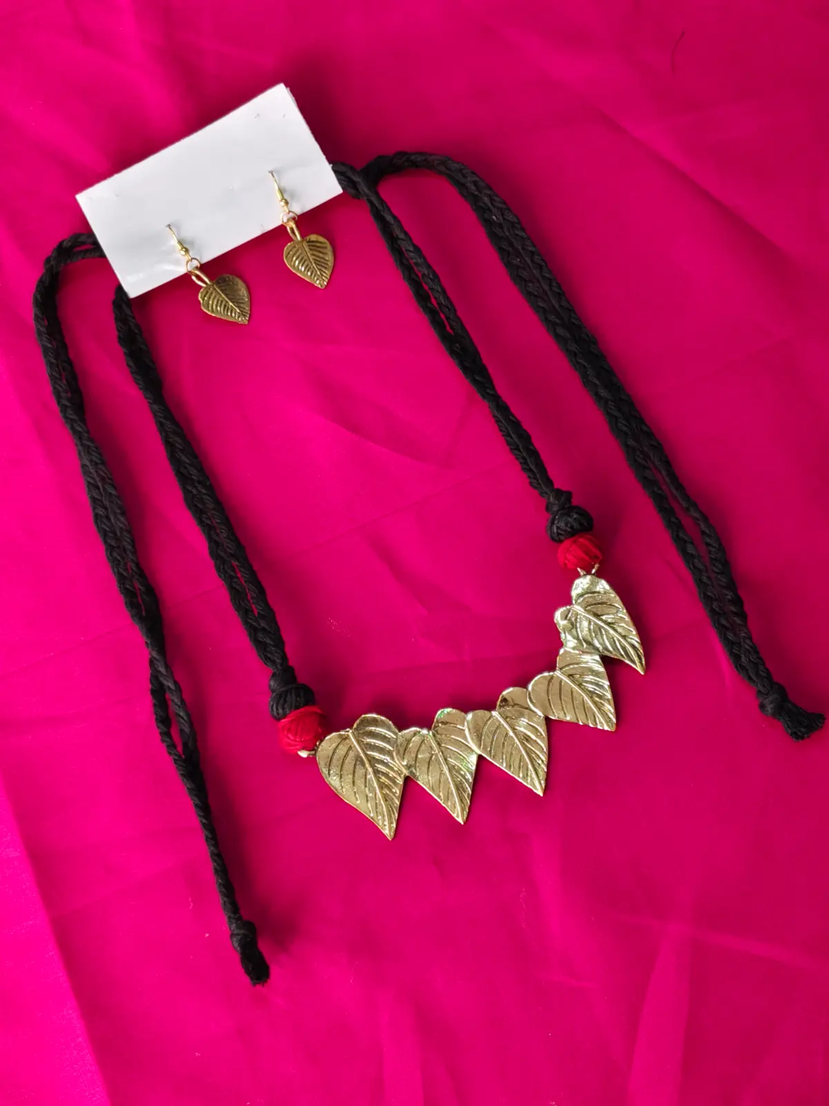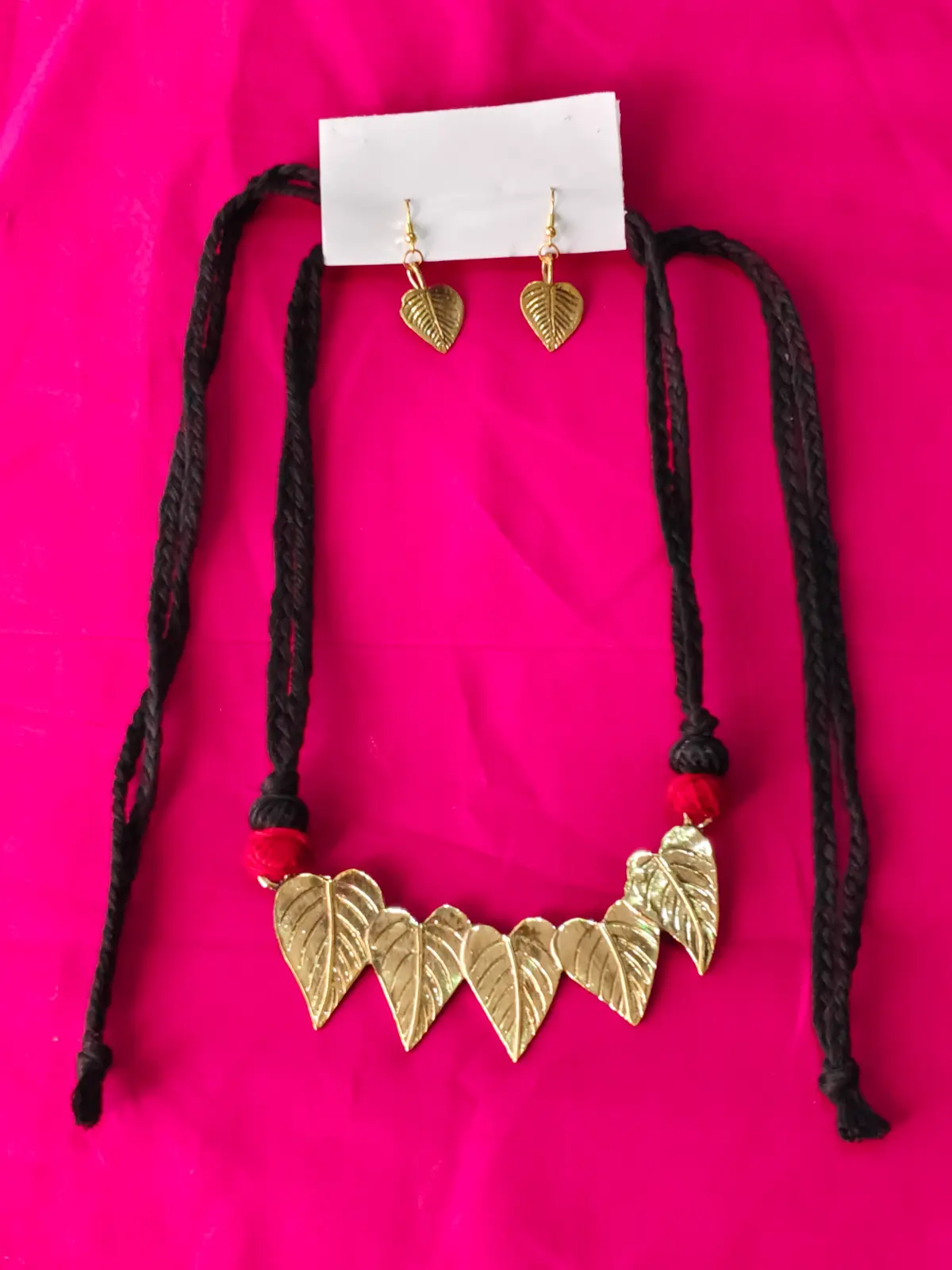 Handcrafted Dokra Brass Leaf Motif Necklace Set – Black thread