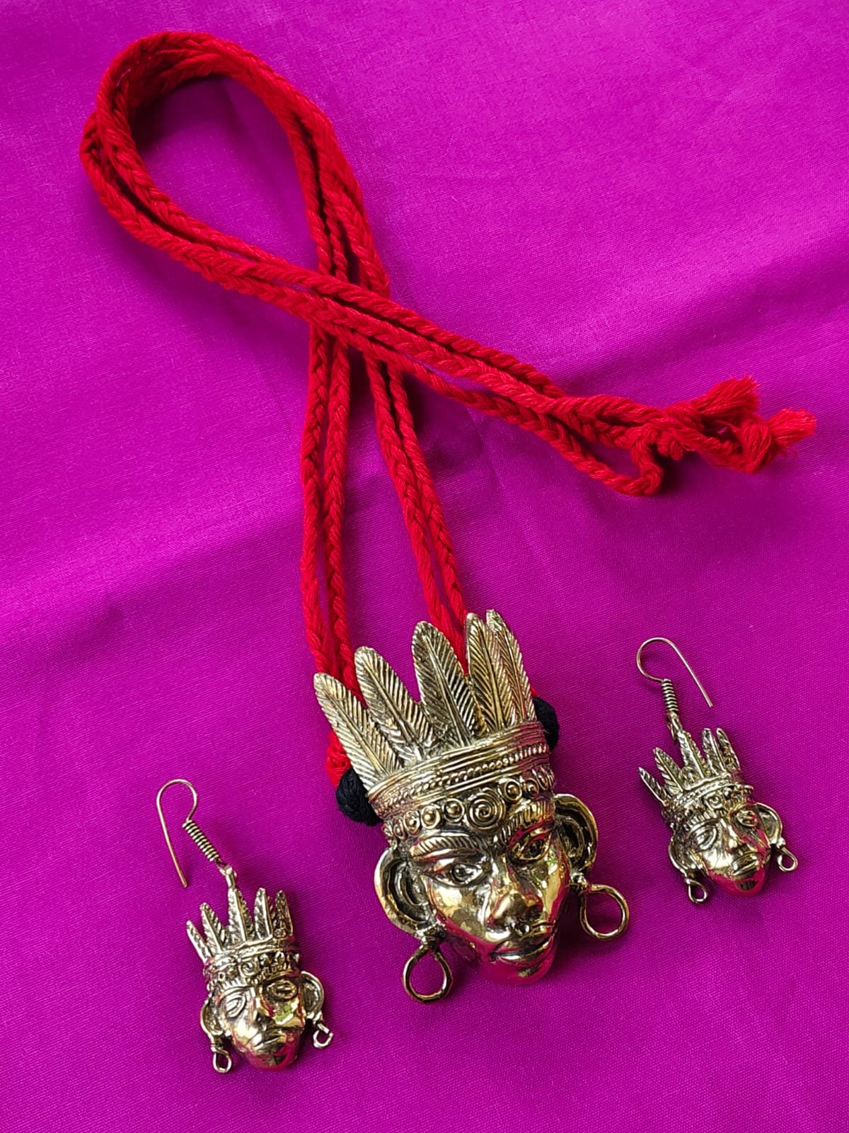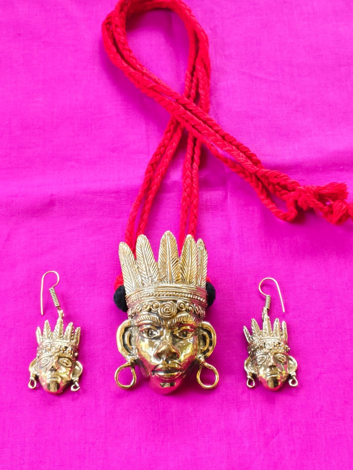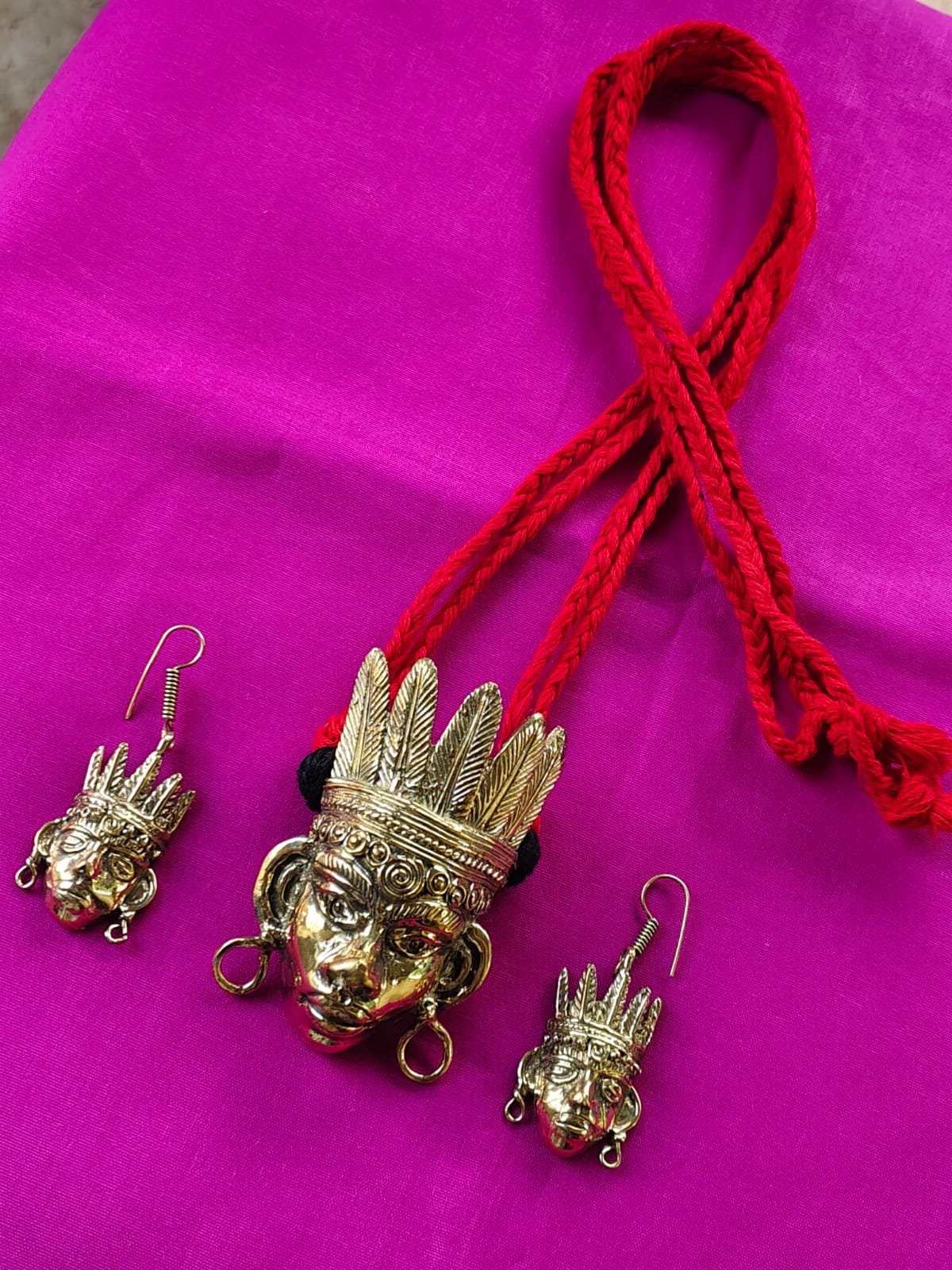 Celebrate the charm of Indian tribal art with this exquisite handcrafted Dokra jewelry set. Featuring a bold brass pendant with intricate tribal face design and matching earrings, this set is a true example of traditional craftsmanship. The pendant comes with a vibrant red woven cotton thread, making it lightweight, comfortable, and stylish. Perfect for adding a unique ethnic touch to festive, cultural, or casual outfits.