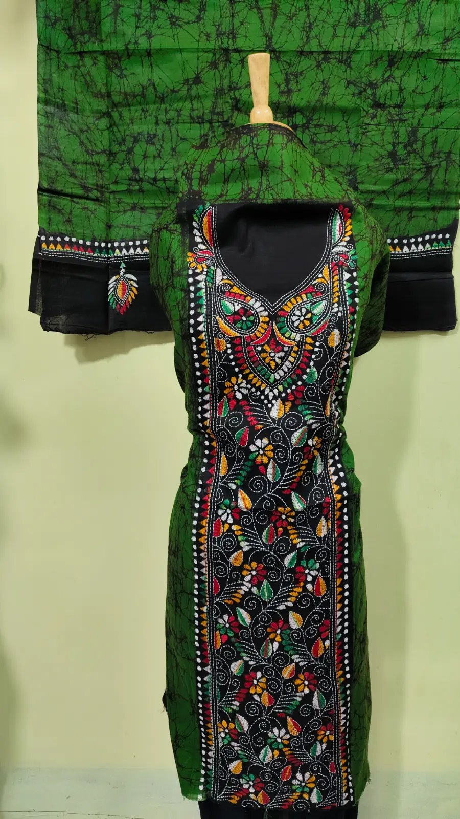 Elevate your ethnic charm with this beautifully handcrafted Kantha Stitch 3-Piece Salwar Suit Dress Material Set, designed for comfort, elegance, and versatility. This unstitched set includes a top, bottom, and dupatta made of 100% cotton, adorned with intricate Kantha stitch embroidery and traditional batik patterns.