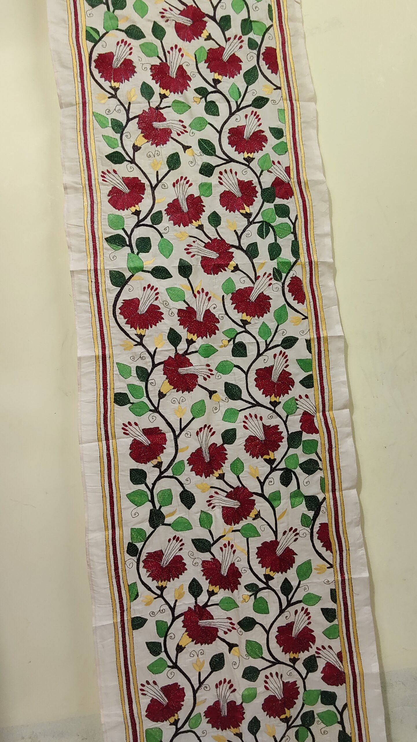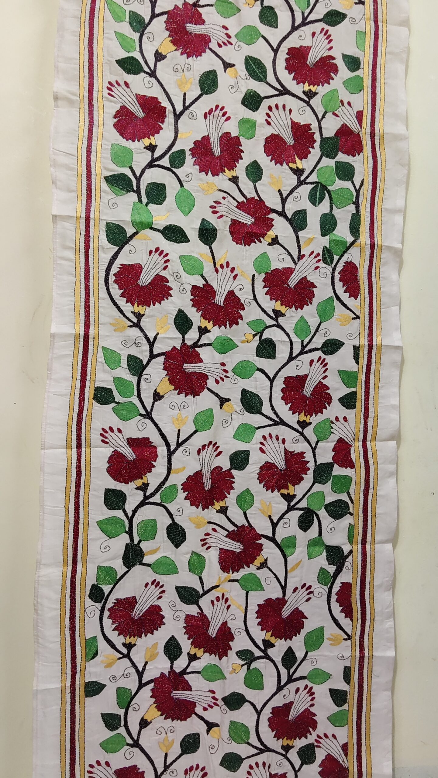 This beautiful handmade Kantha stitch stole is a unique testament to traditional craftsmanship. Featuring intricate motifs of red flowers and green foliage set against an off-white base, the stole exudes an air of exceptional charm and elegance. Every stitch reflects the flawless handiwork of skilled artisans, adding a truly unique touch to your look.