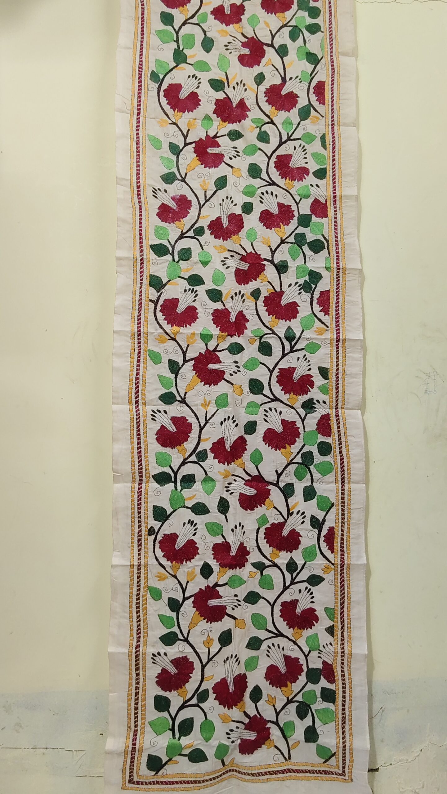 This beautiful handmade Kantha stitch stole is a unique testament to traditional craftsmanship. Featuring intricate motifs of red flowers and green foliage set against an off-white base, the stole exudes an air of exceptional charm and elegance. Every stitch reflects the flawless handiwork of skilled artisans, adding a truly unique touch to your look.