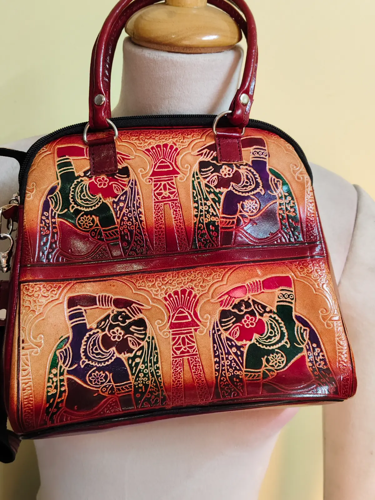 This bag has a pocket inside which is divided by a chain and also divided by a chain outside. Made of genuine leather, a beautiful ethnic art of West Bengal.