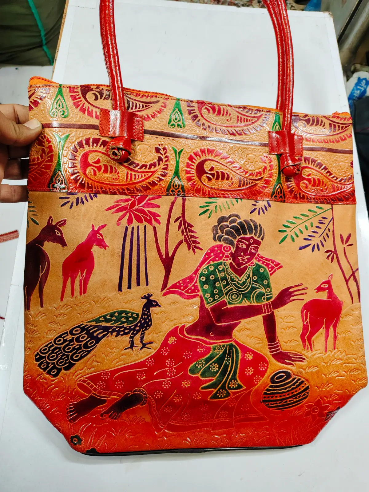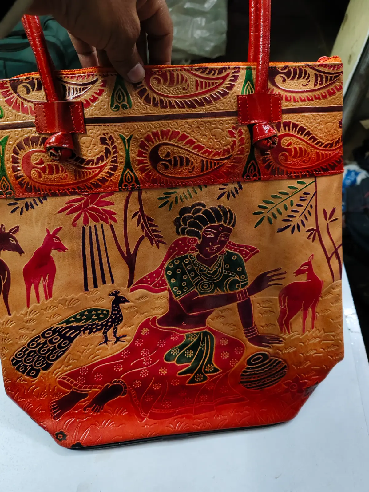 This bag has a pocket inside which is divided by a chain and also divided by a chain outside. Made of genuine leather, a beautiful ethnic art of West Bengal.