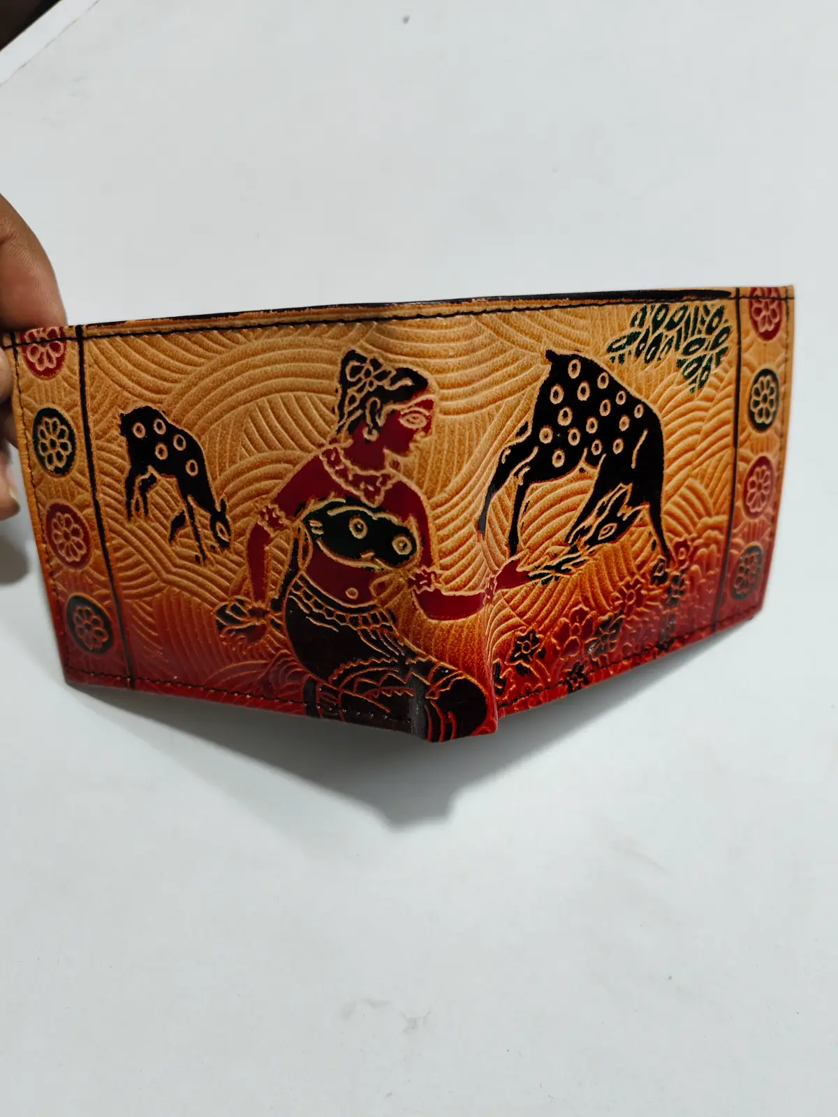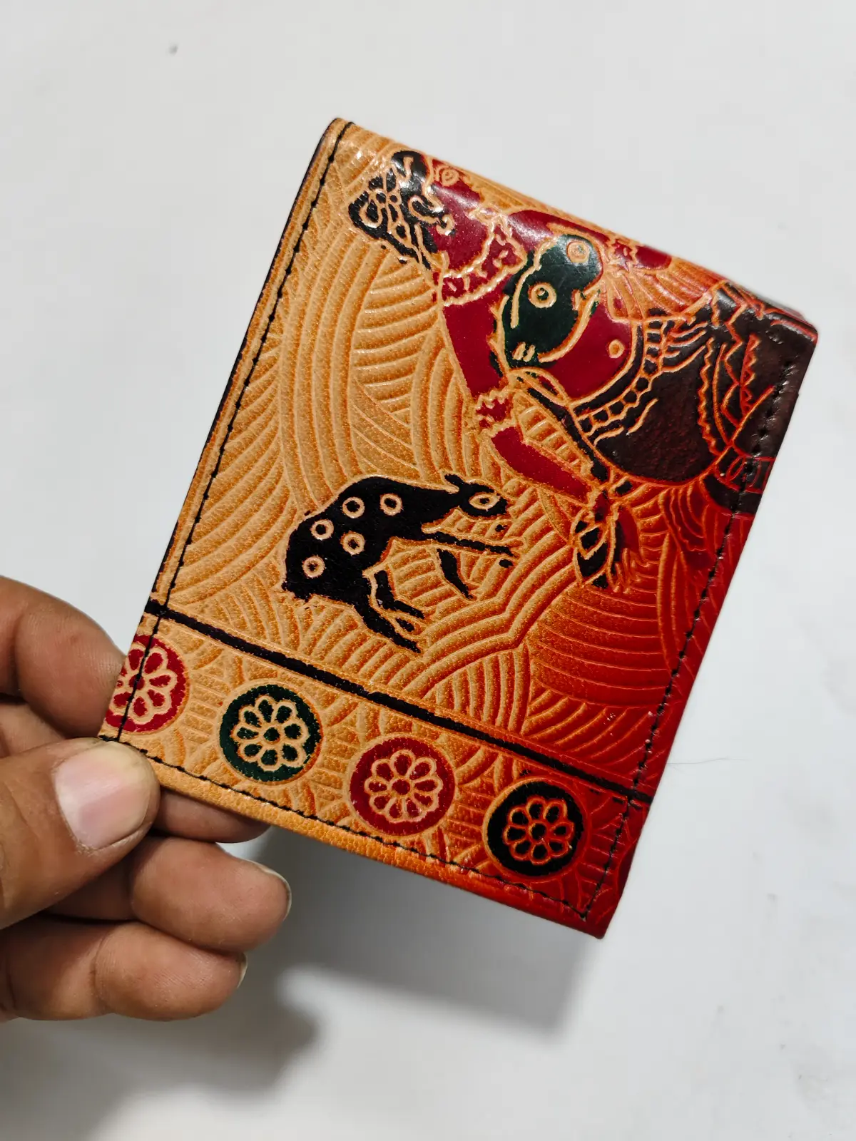 This handcrafted Shantiniketan leather wallet features traditional embossed artwork inspired by Bengal’s rich cultural heritage. Made from premium quality leather, it showcases intricate hand-painted motifs and gradient shading that gives it a luxurious artisanal finish. The wallet is lightweight yet durable, with multiple compartments for cash and cards, making it both functional and stylish. A perfect gift or personal accessory for those who appreciate Indian handicrafts and timeless artistry.