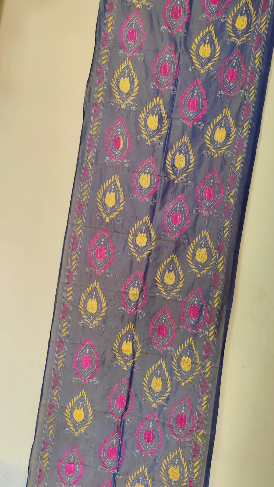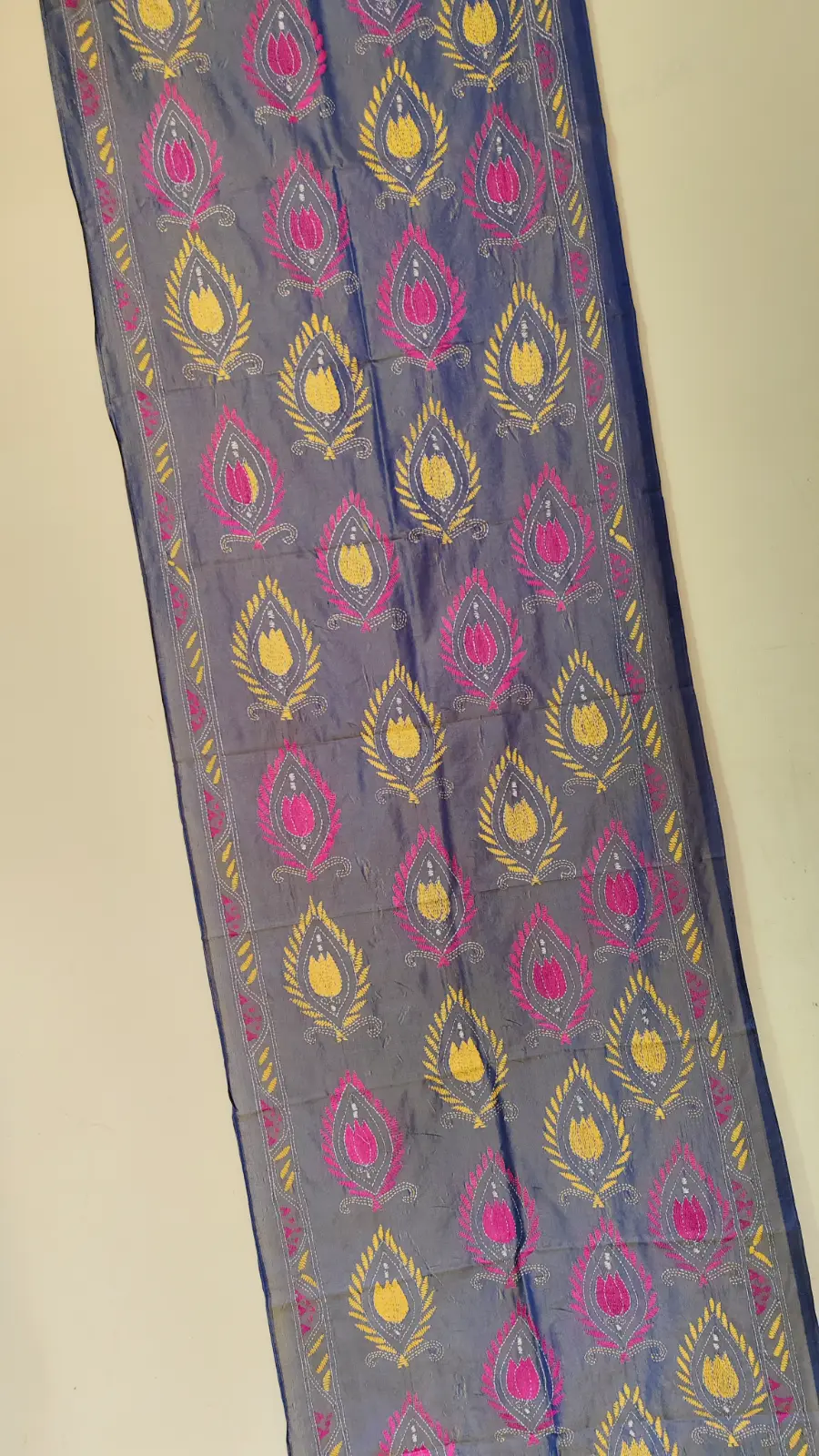 This elegant navy Dual tone color silk stole features hand-embroidered Kantha stitch work with charming white dotted patterns and multicolored floral motifs. The combination ofΒ Yellow, and Red threadwork brings a fresh and graceful vibe to the traditional look. Ideal for pairing with casual or ethnic wear and perfect for gifting.s.