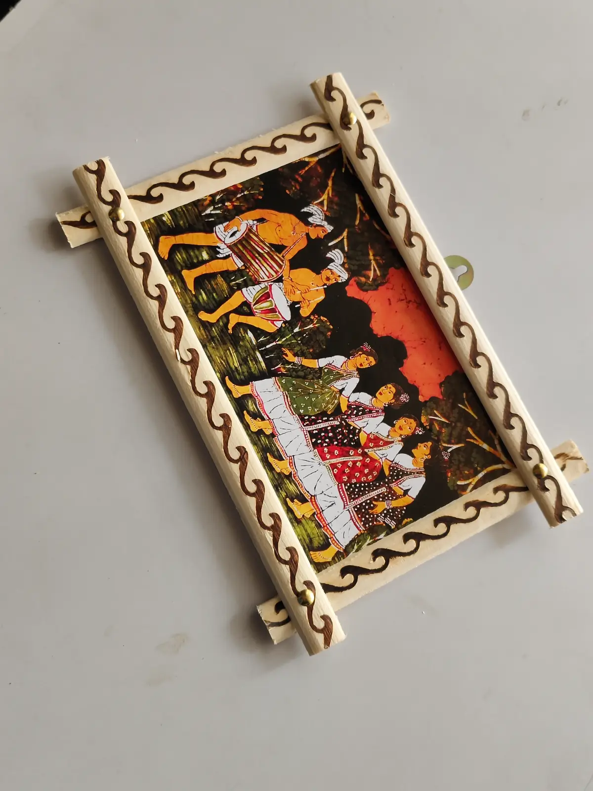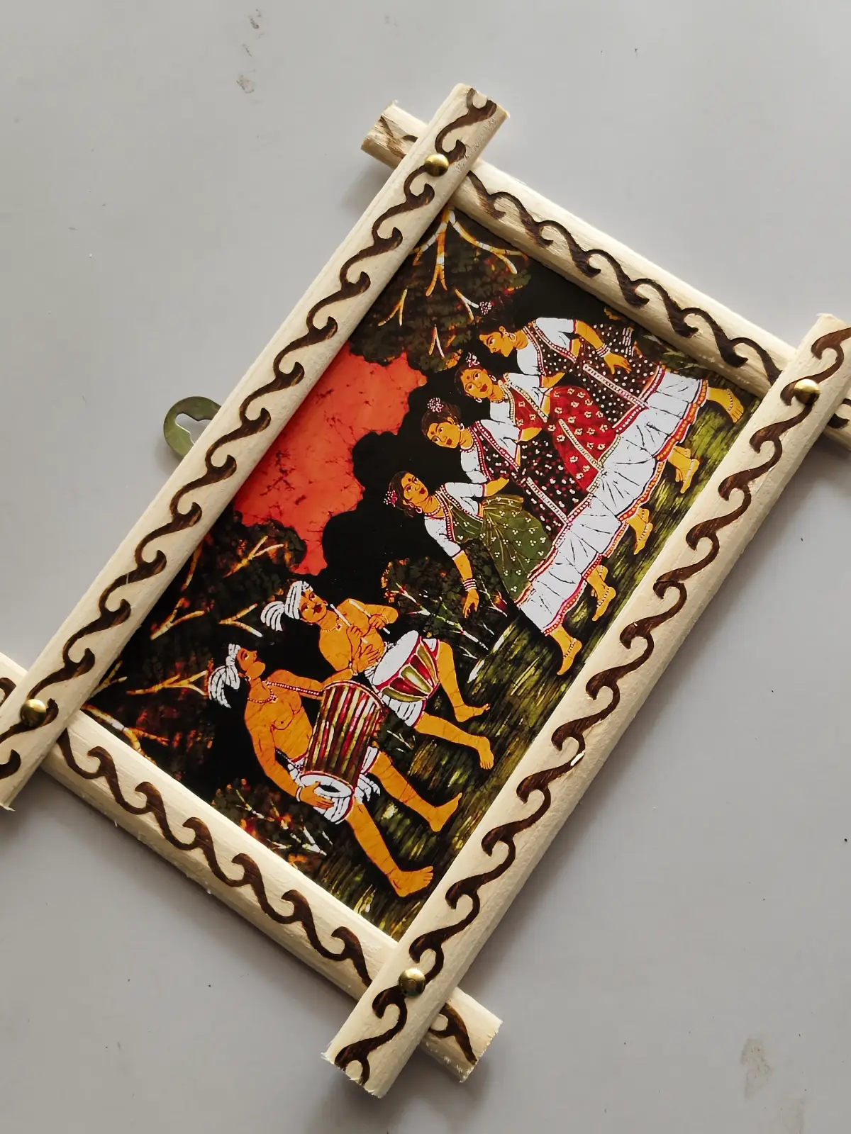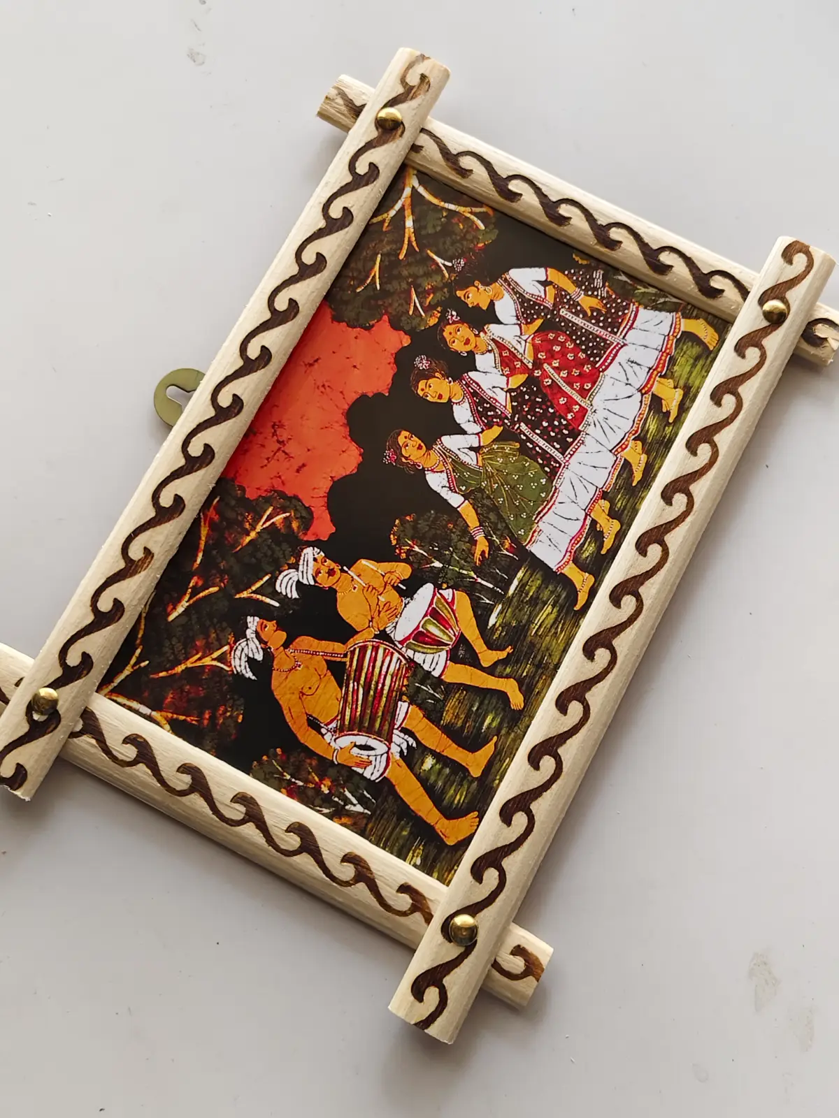 This wall hanging is crafted from natural wood and features a vibrant hand-painted folk art scene showcasing traditional dance and musical performance. The artwork highlights rich earthy tones with bright accents, beautifully framed with decorative wooden borders for an elegant finish. Designed to bring cultural charm to your space, it is perfect for living rooms, hallways, or as a unique gift piece. Lightweight yet sturdy, it is easy to hang and adds a warm, artistic touch to any décor. Each piece is handcrafted, making every artwork one-of-a-kind. Wipe gently with a dry cloth and keep away from moisture to maintain its beauty.