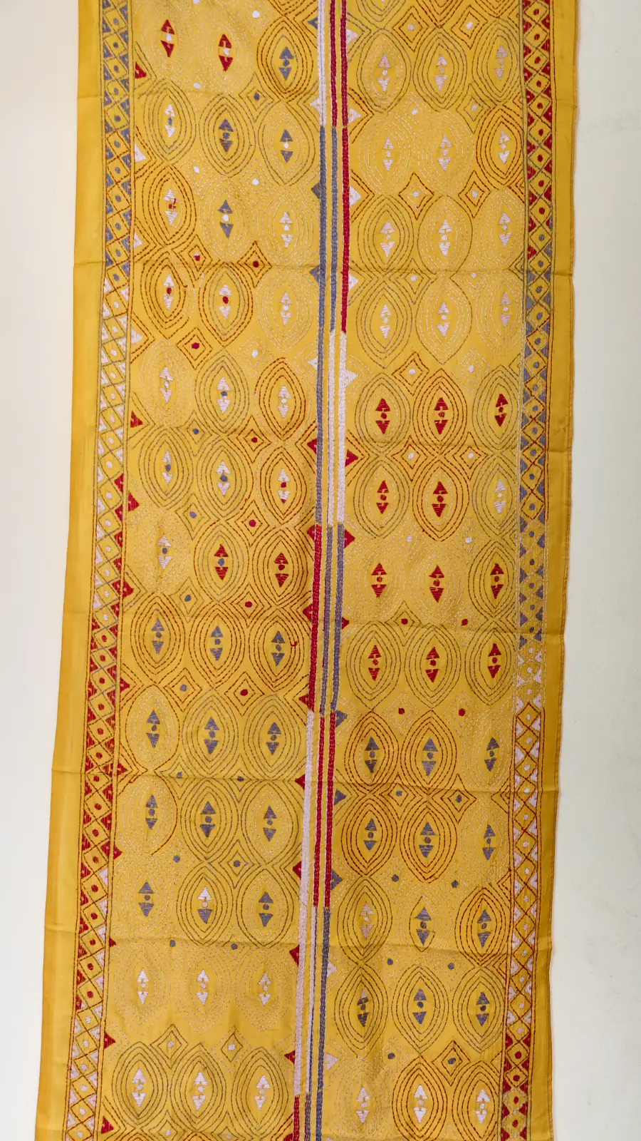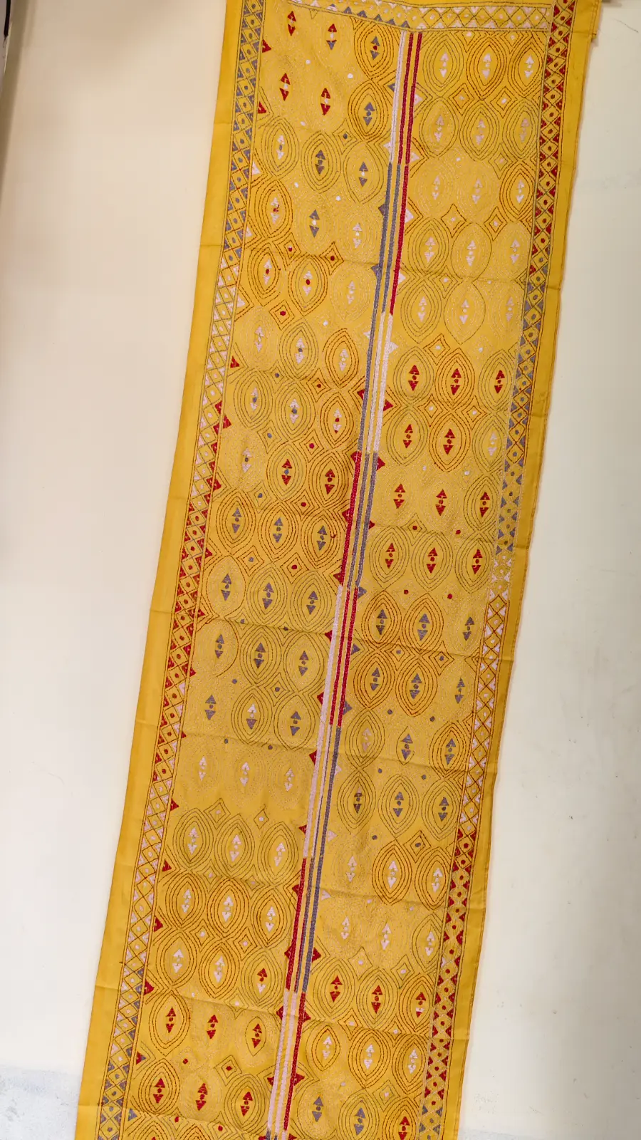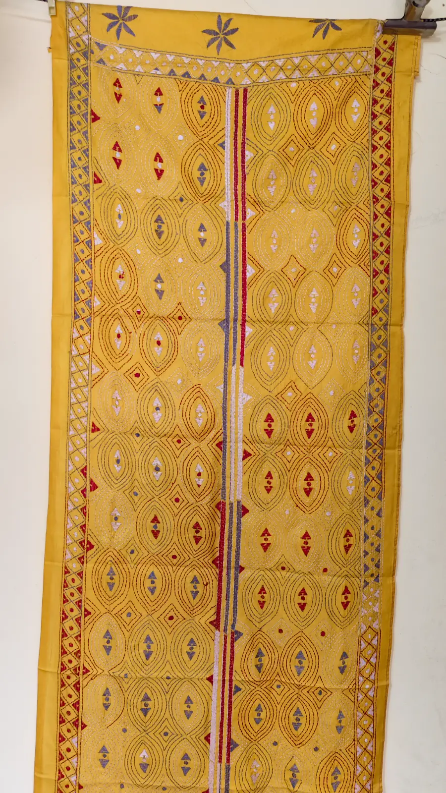 This stunning handmade stole has a wide border beautifully decorated, enhance your style, which is made of premium yellow color silk and decorated with traditional Kantha stitch embroidery. The elegant floral motifs are beautifully highlighted with silver, red, white colors, creating a timeless look. Suitable for both casual and festive outfits, this light and soft stole adds a touch of traditional charm to any outfit.