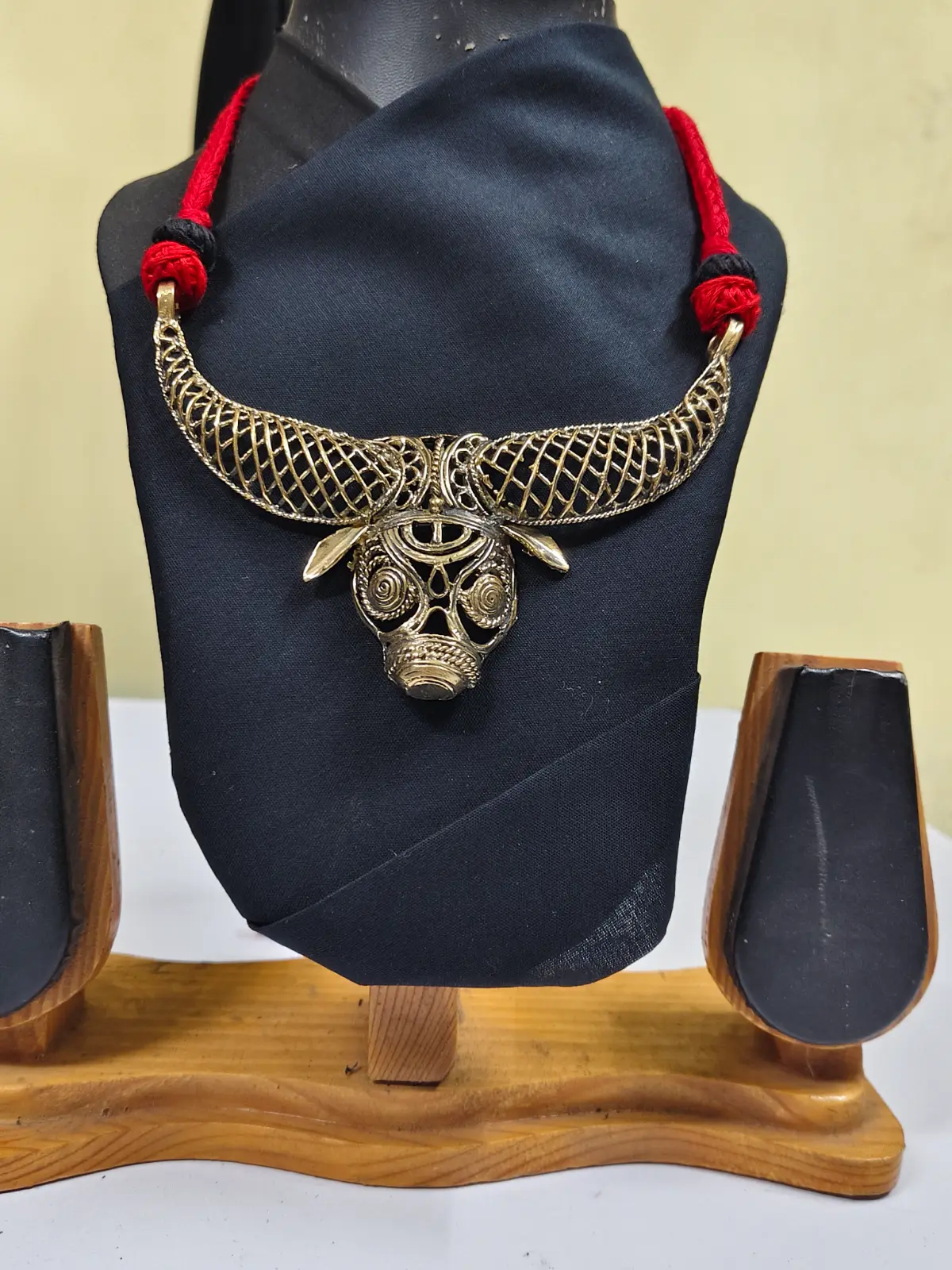 Handmade Dokra Brass Bull Head Necklace Made with Red Thread