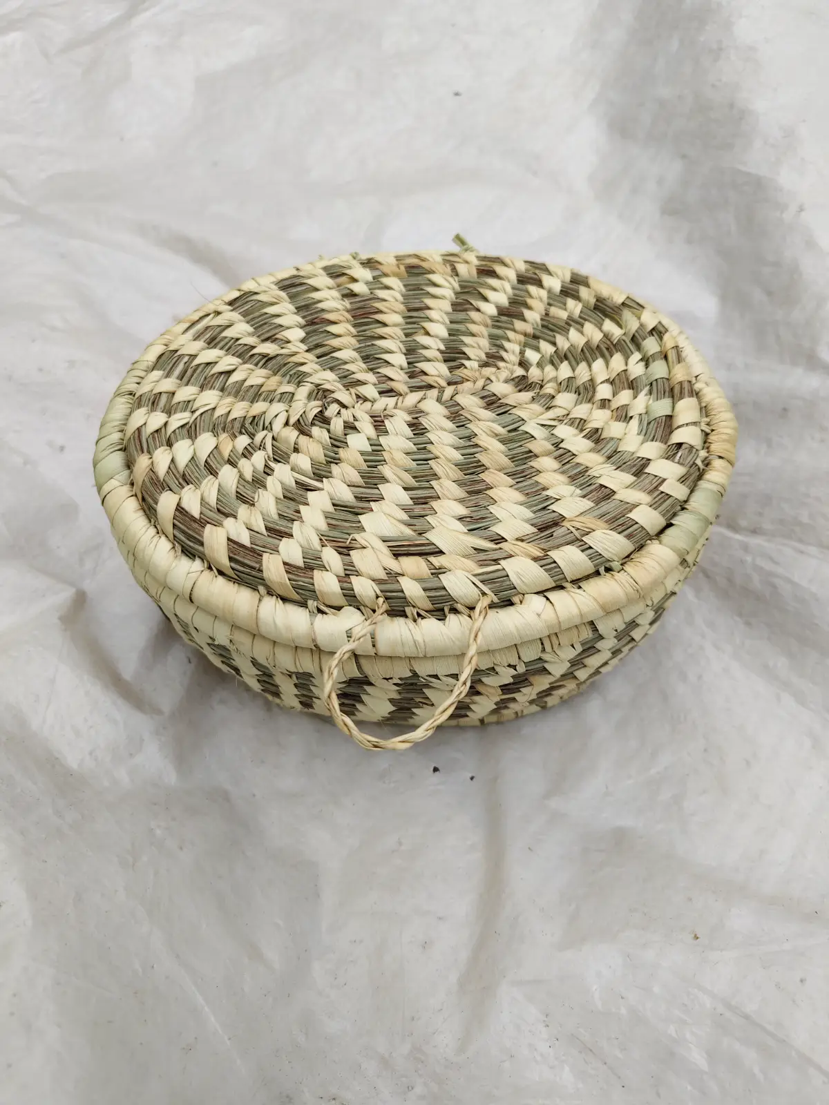 Handmade organic grass jewelry box – The round lid is attached to the box.