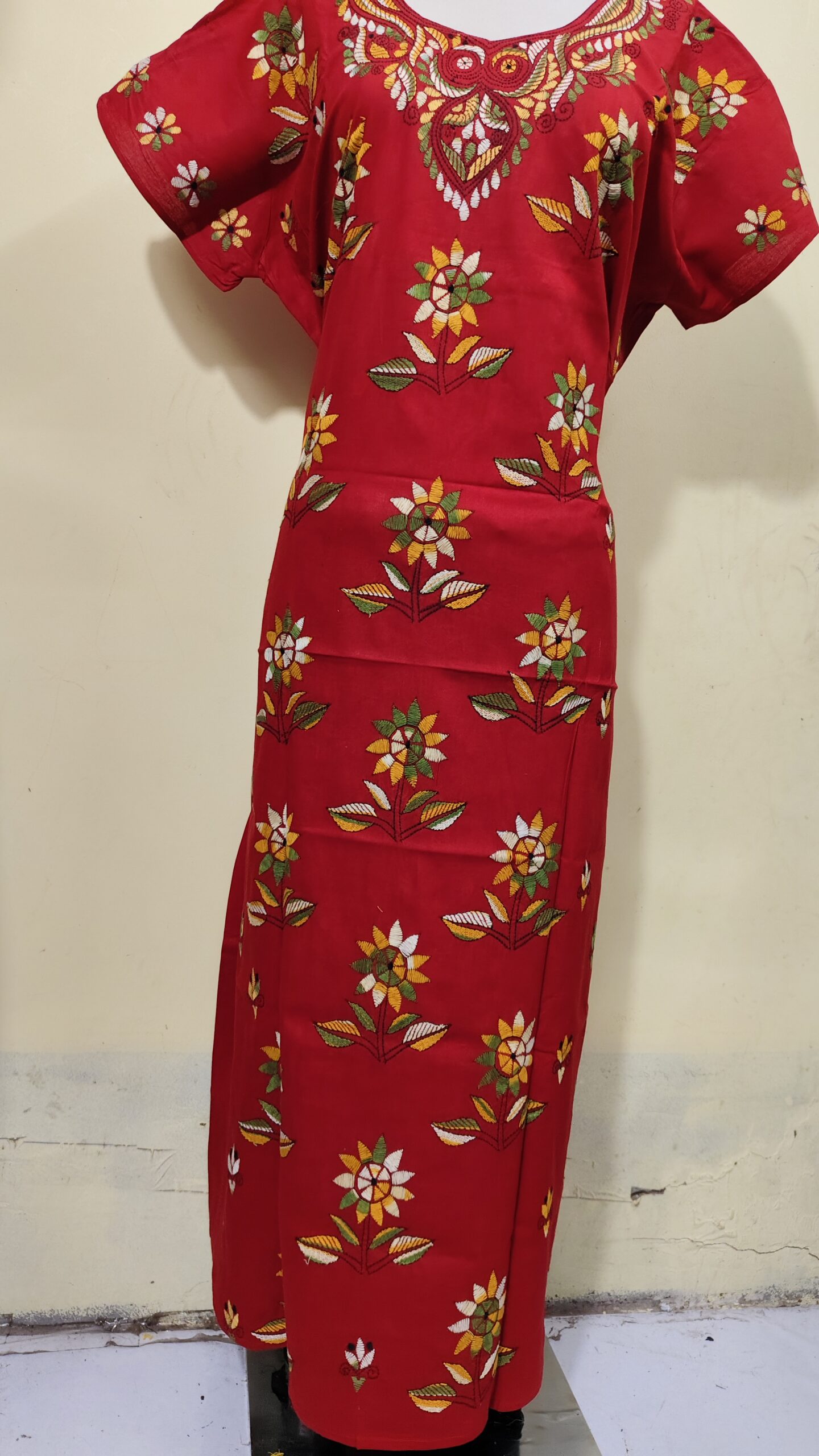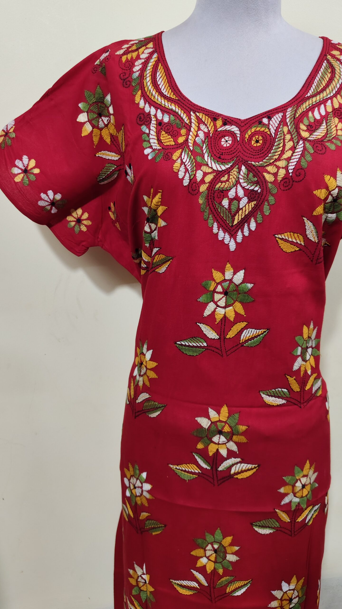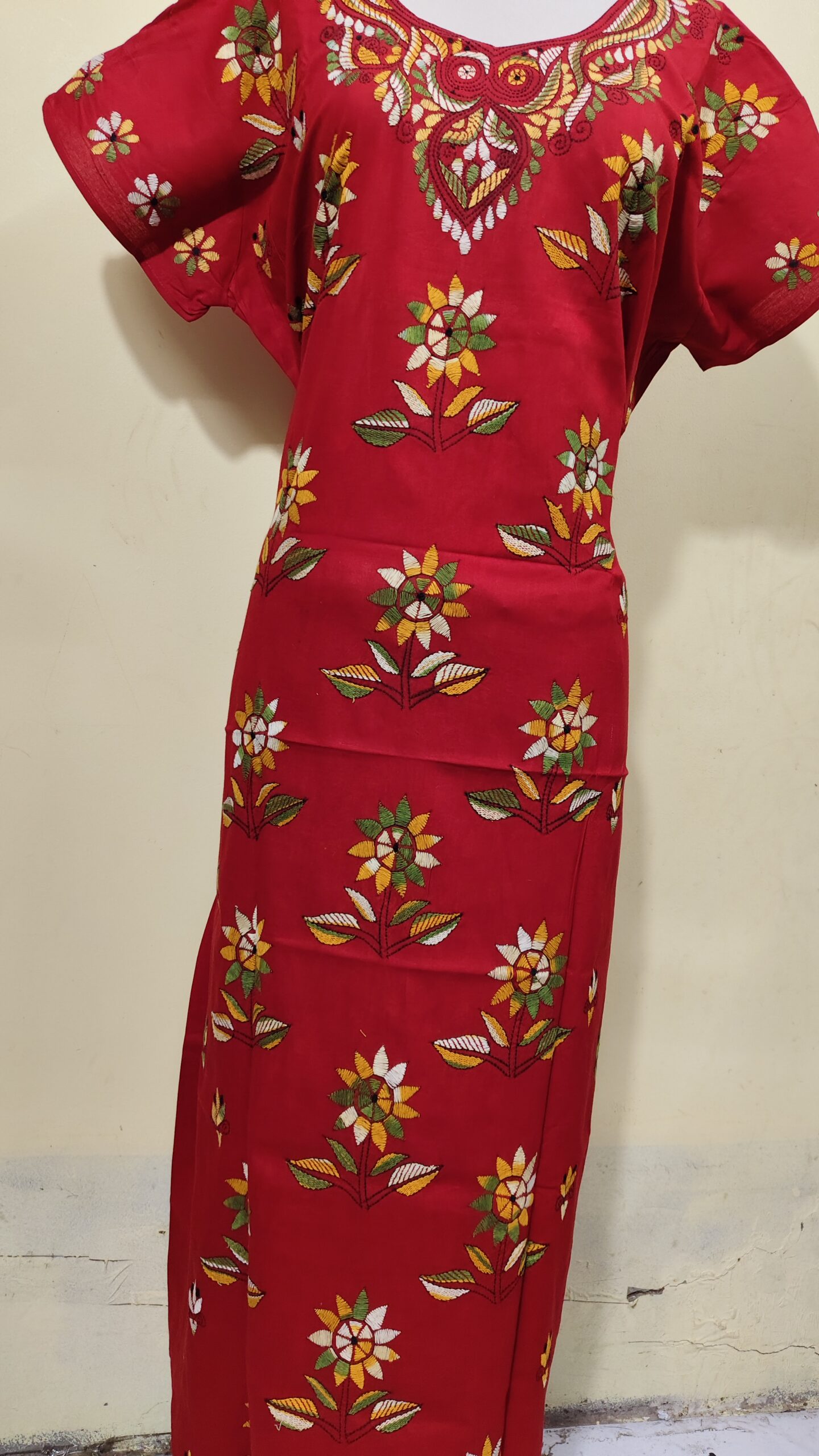 This kaftan nighty is made from soft and breathable cotton fabric, beautifully enhanced with traditional Kantha stitch detailing. The design features subtle patterns with comfortable loose fitting, wide sleeves, and a relaxed silhouette for ease of movement. Lightweight and airy, it is perfect for nightwear or lounging at home, especially in warm weather. The handcrafted Kantha work adds a unique artisanal touch, making each piece special. Gentle hand-wash recommended, dry in shade, and iron on reverse for long-lasting use.