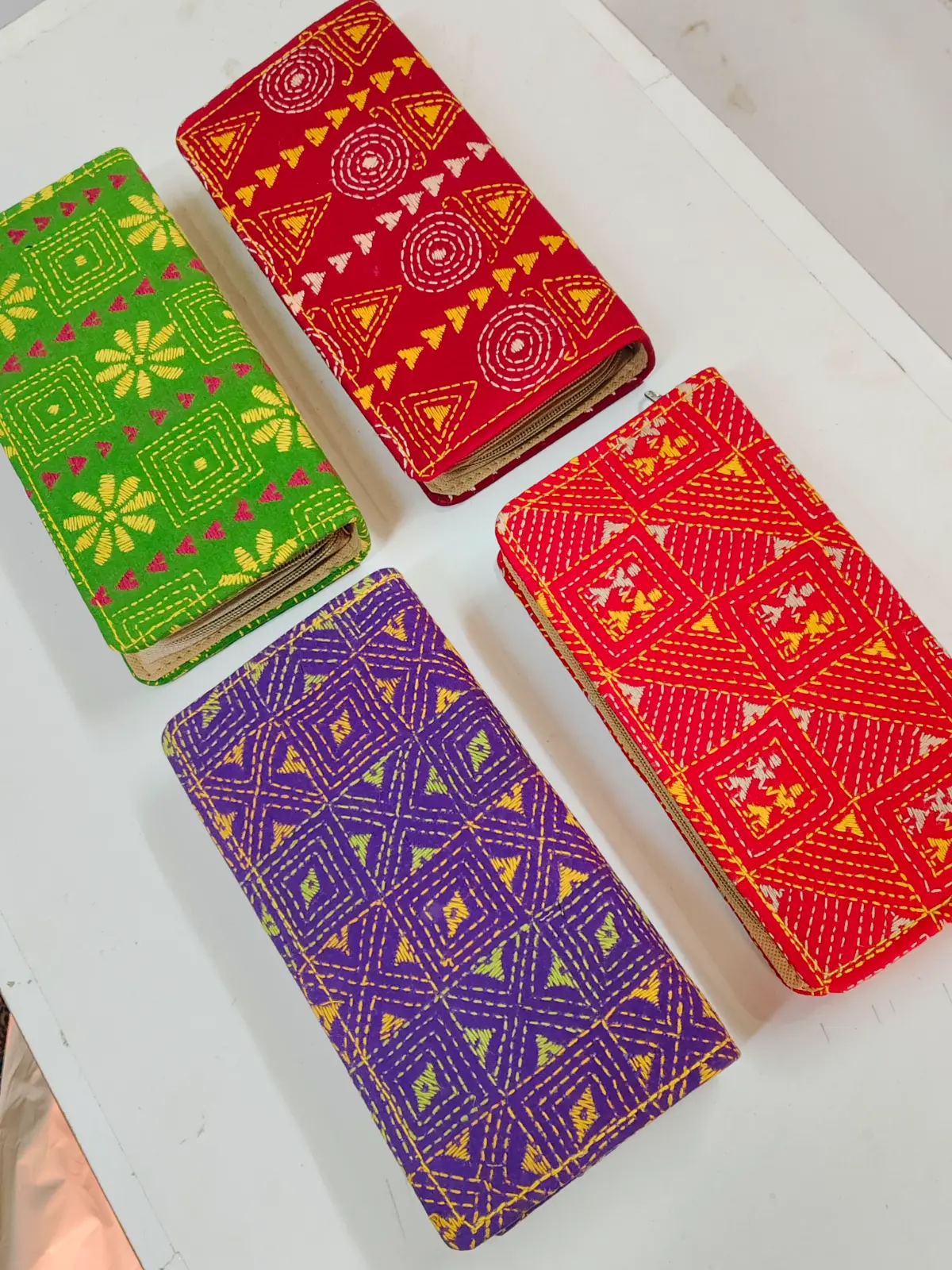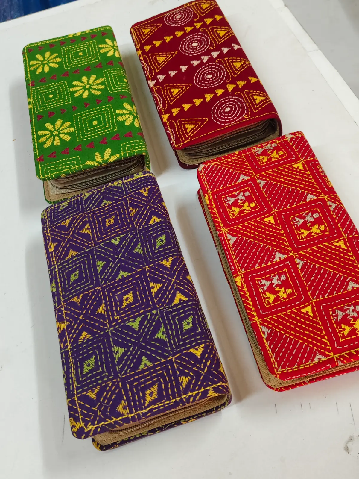 Stylish Handcrafted cotton wallet with Kantha stitch embroidery. Features two zipper compartments and Multiple pockets. 📏 Size: Long 8 inch, Wide 4 inch, Height 1.5 inch (Quantity 4 piece)