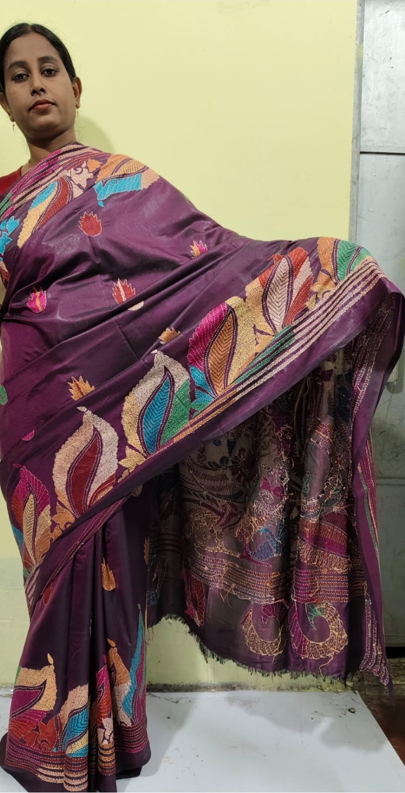 This elegant saree is crafted from soft art silk and richly adorned with traditional Bengal Kantha embroidery.