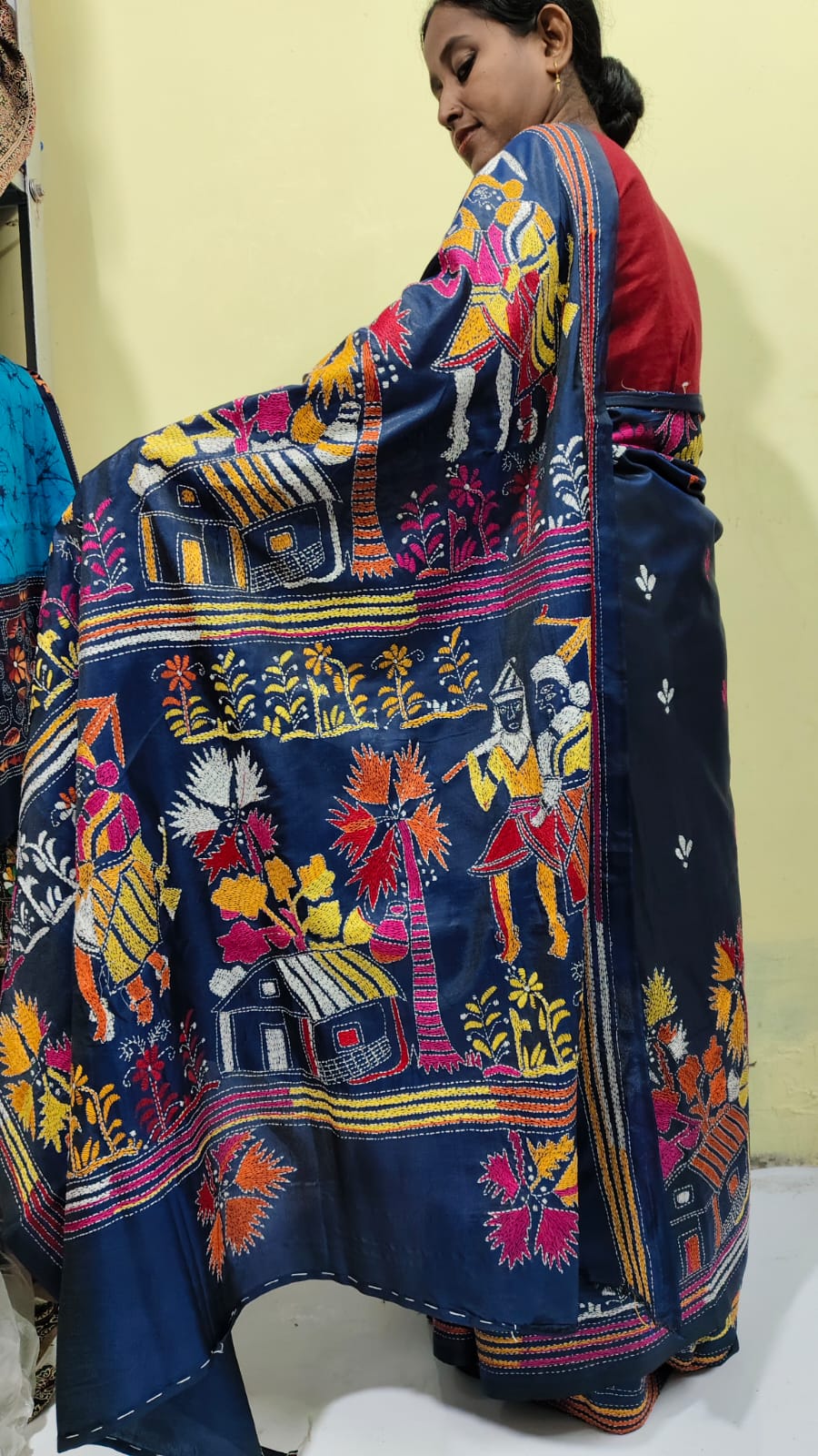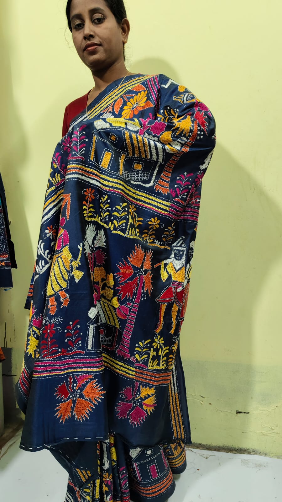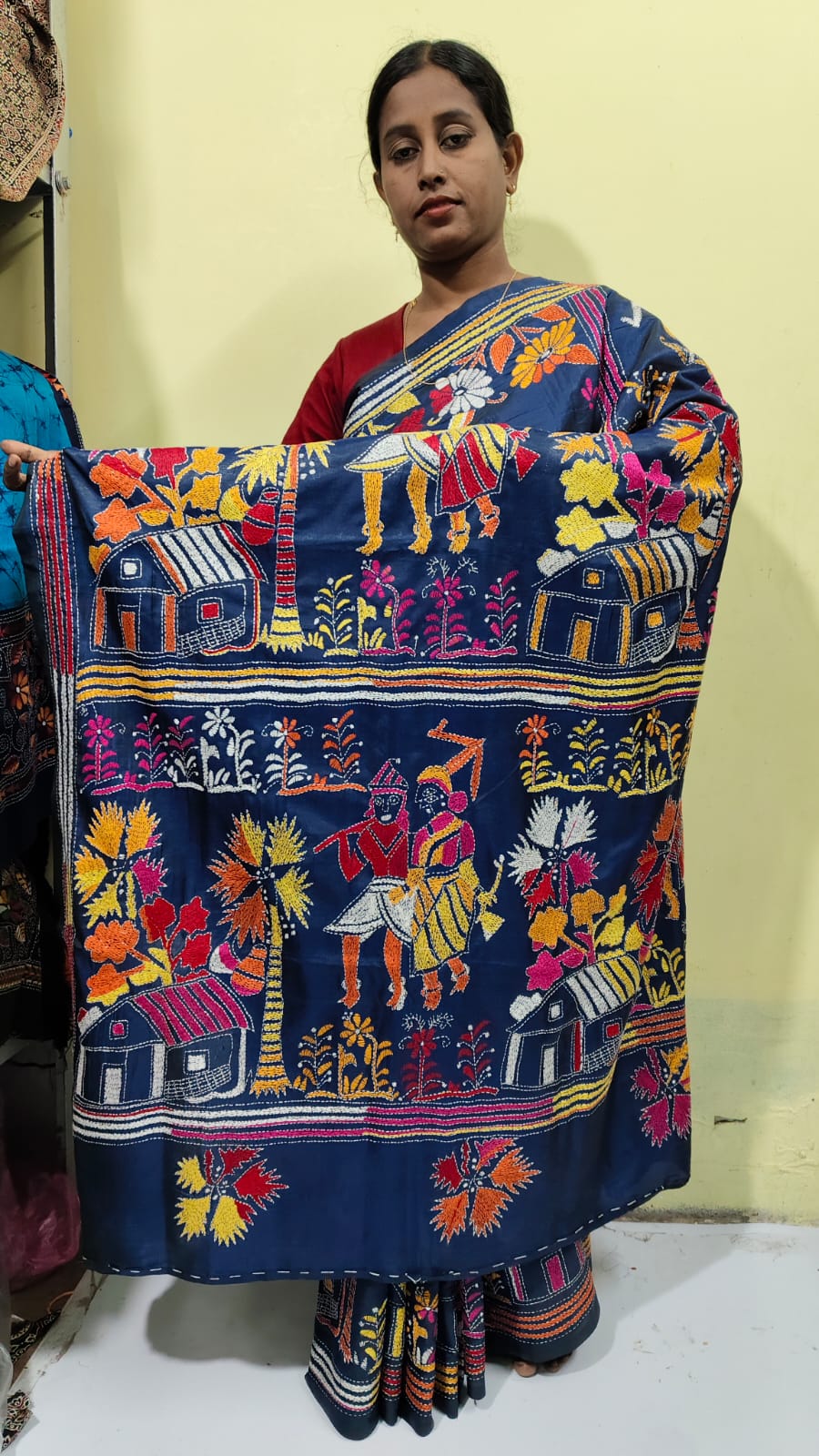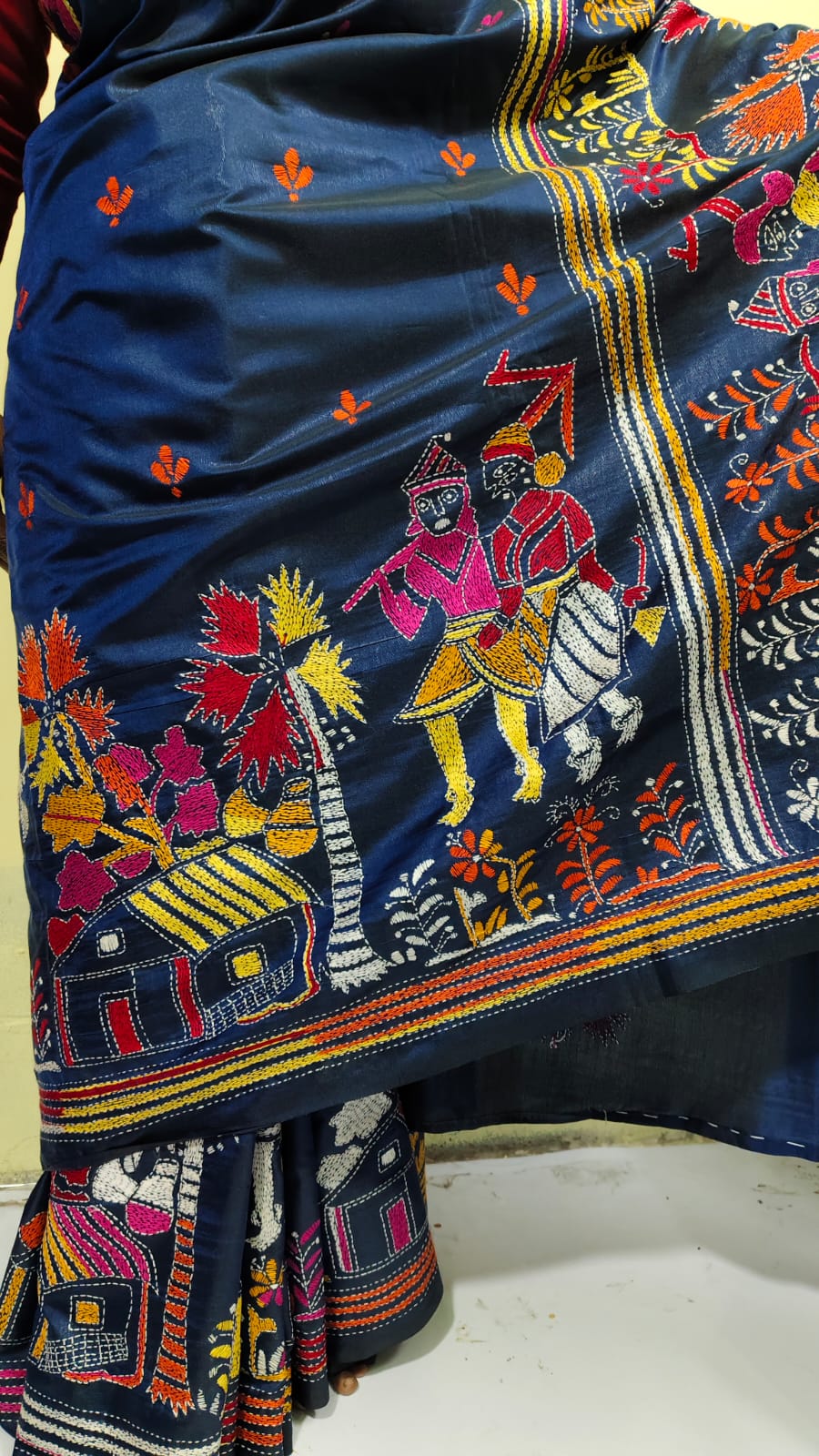 A beautifully handcrafted Art Silk Saree featuring detailed Kantha Stitch embroidery with tribal motifs, floral vines, village scenes, and vibrant multicolor threadwork. The rich navy base enhances the intricate stitching, creating a stunning artistic look. Perfect for festive wear, cultural programs, and special occasions. Each saree is uniquely hand-embroidered by skilled artisans, making it a timeless collectible piece inspired by Bengal’s traditional craftsmanship.
