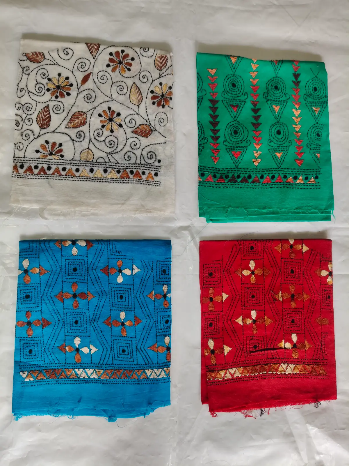 These beautiful Kantha stitch blouse pieces are made of cotton fabric, which is comfortable and attractive to wear. Each blouse has exquisite handwork – floral and traditional motifs are highlighted in the white and colored thread Kantha design.