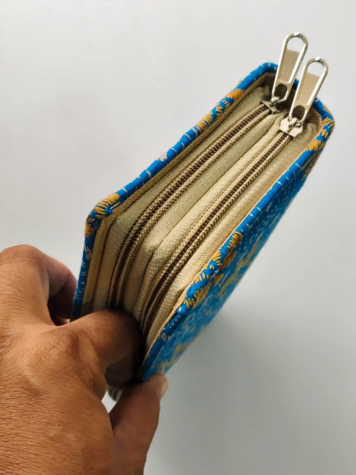 Kantha Stitch Cotton Zip Wallet – Double Zipper Compartments Blue color