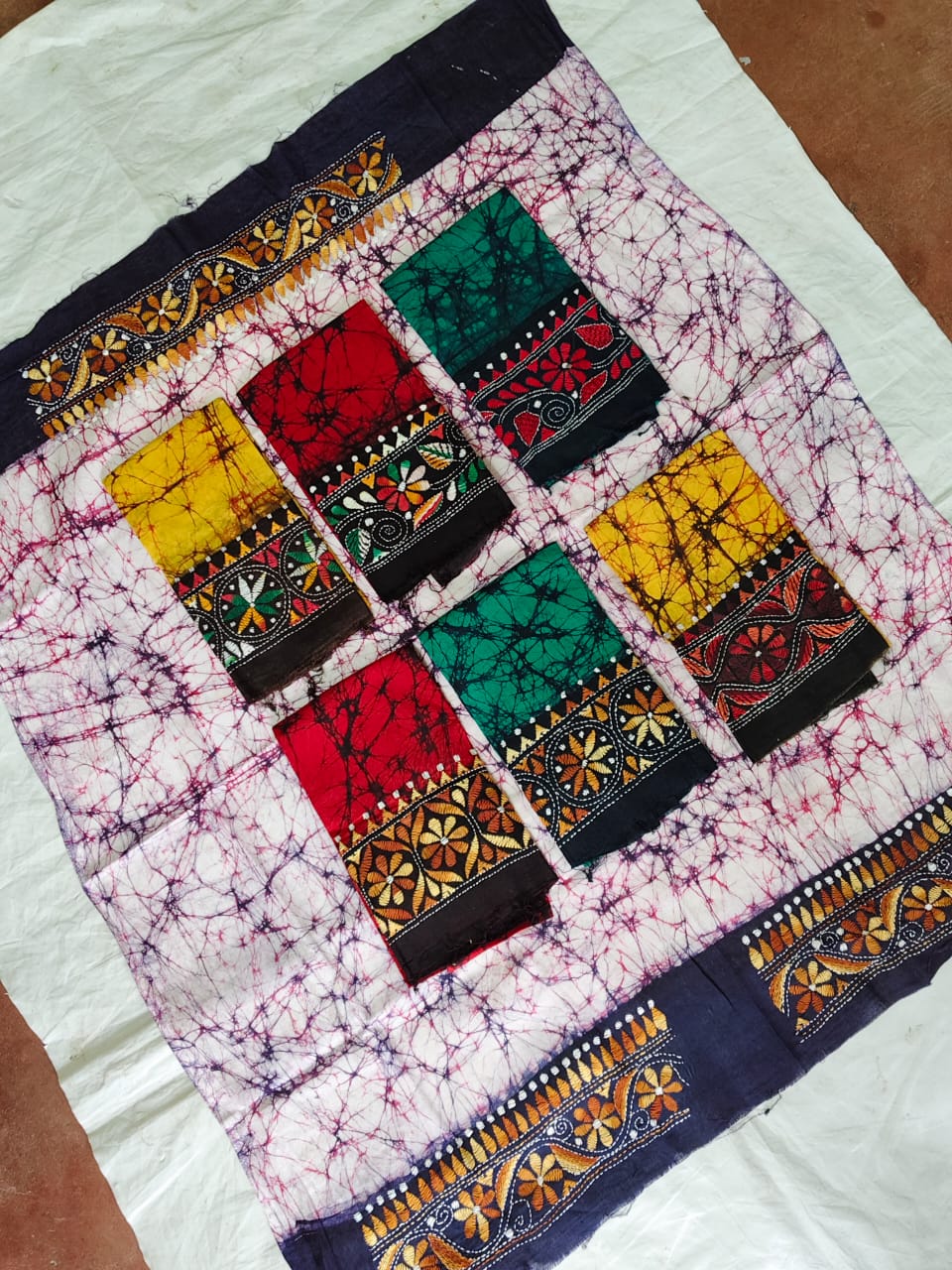 This exclusive combo set of 6 handmade Kantha Batik blouse materials brings together the beauty of Bengal hand embroidery with the rich texture of traditional Batik dyeing. Each piece is handcrafted on pure cotton, combining vibrant shades like green, blue, purple, and pink with intricate Kantha stitch borders.