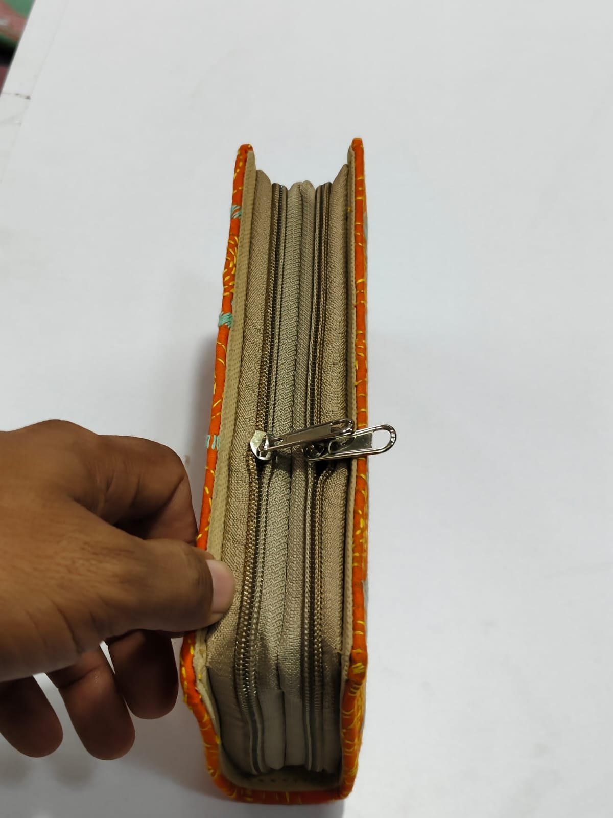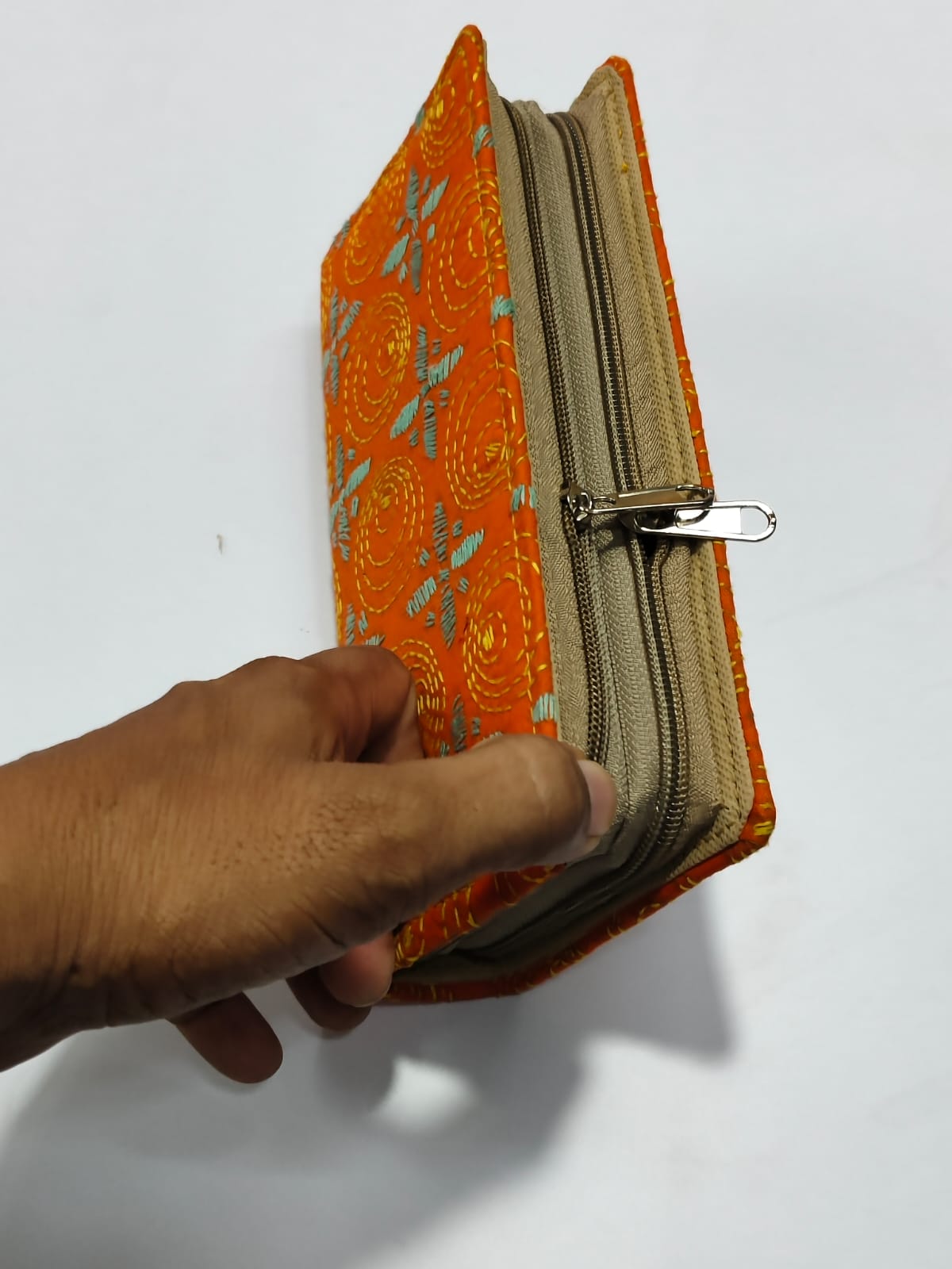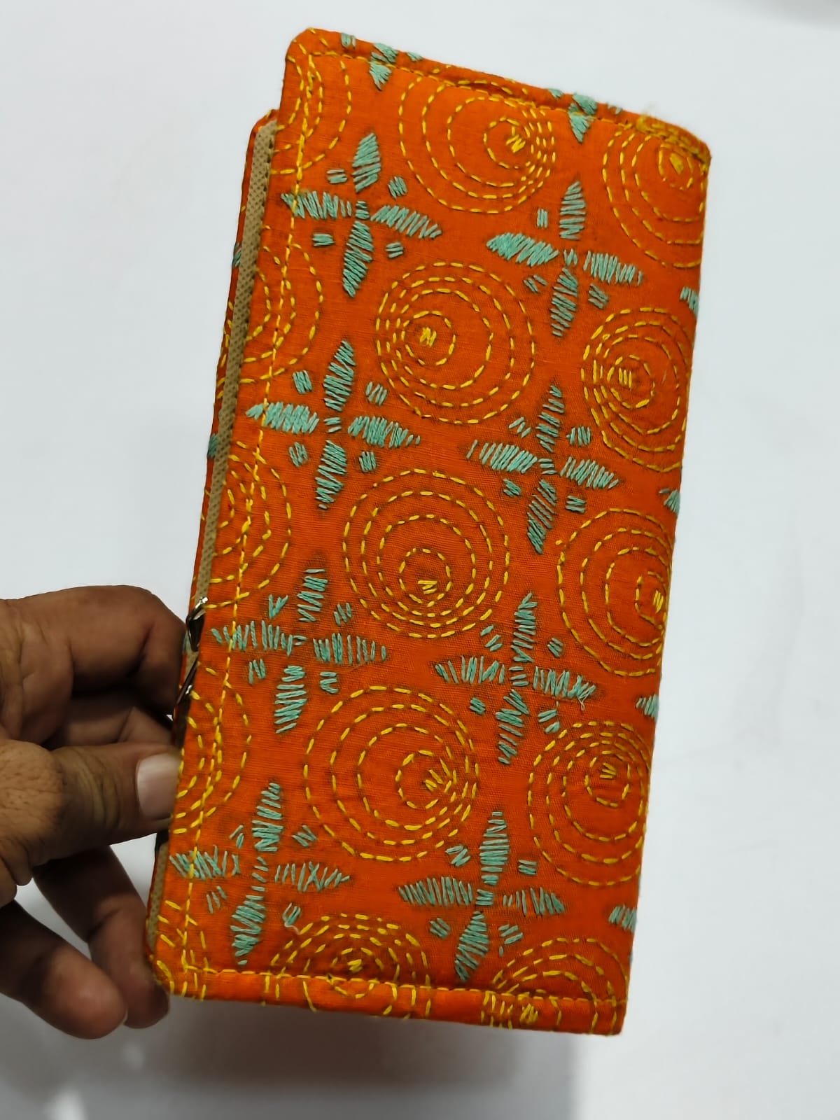 Stylish Handcrafted cotton wallet with Kantha stitch embroidery. Features two zipper compartments and Multiple pockets. đ Size: Long 8 inch, Wide 4 inch, Height 1.5 inch (Quantity 1 piece)