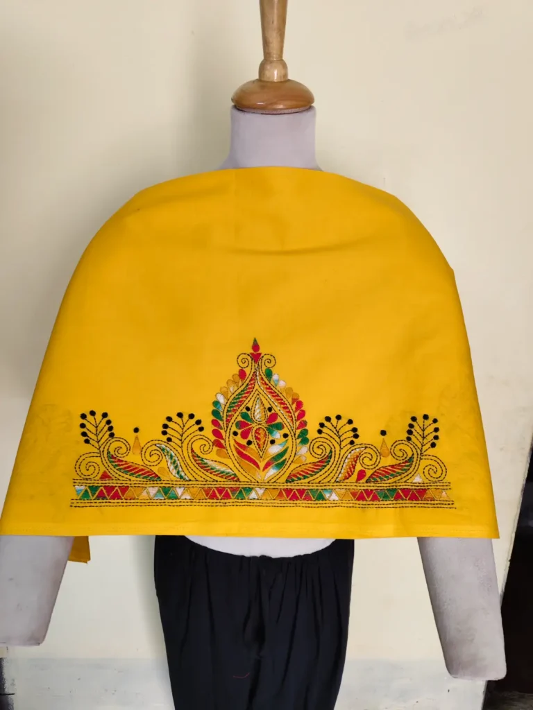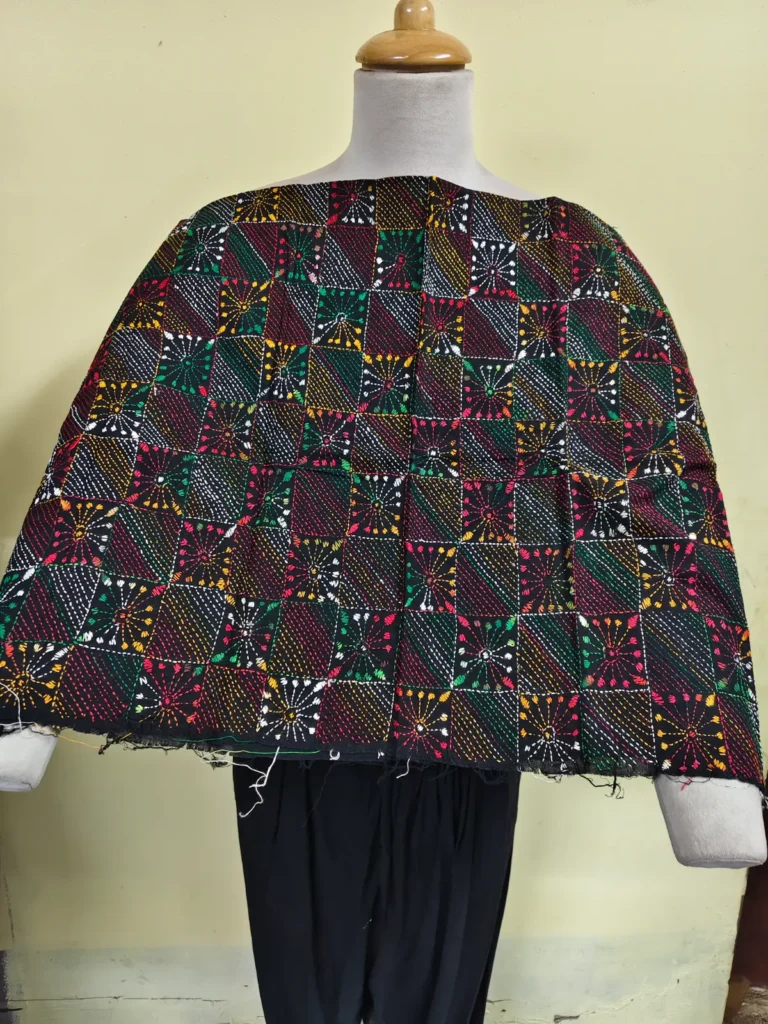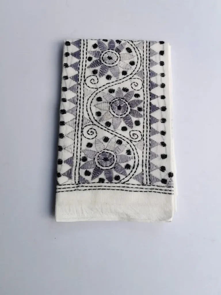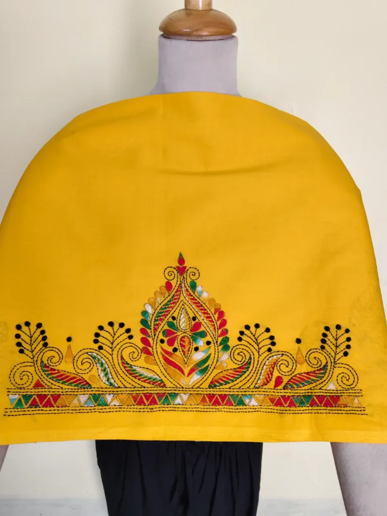 Material: Soft and warm wool fabric, often made from pure wool or wool blend. Embroidery: Delicate Kantha embroidery, hand-stitched by skilled artisans, adorns the shawl. Floral motifs in the embroidery, Weight: Medium-weight wool fabric, perfect for crisp winter mornings and cozy evenings. Feel: Soft, warm, and lightweight, with a subtle texture from the wool fabric. Occasion: Suitable for everyday wear, office or special occasions such as festivals, weddings or cultural events. Unique Features: Each Kantha wool shawl is hand-embroidered.