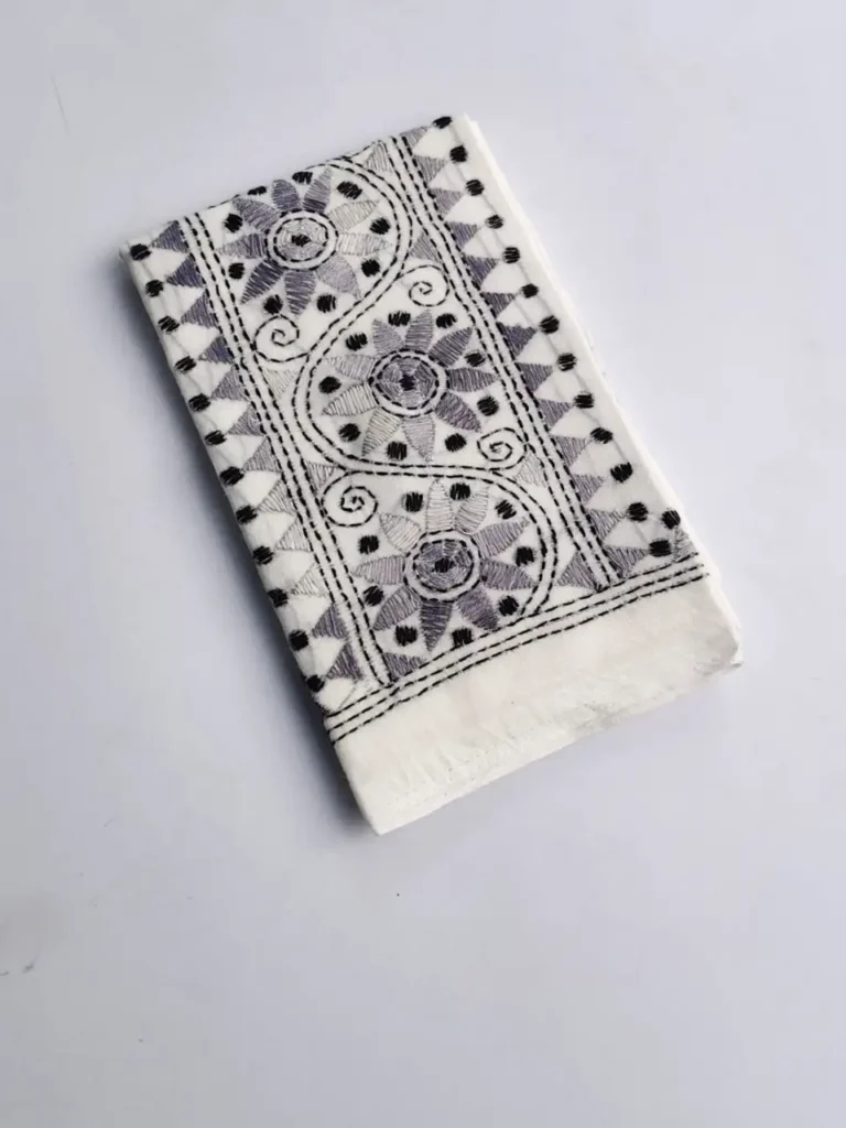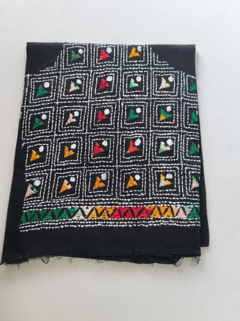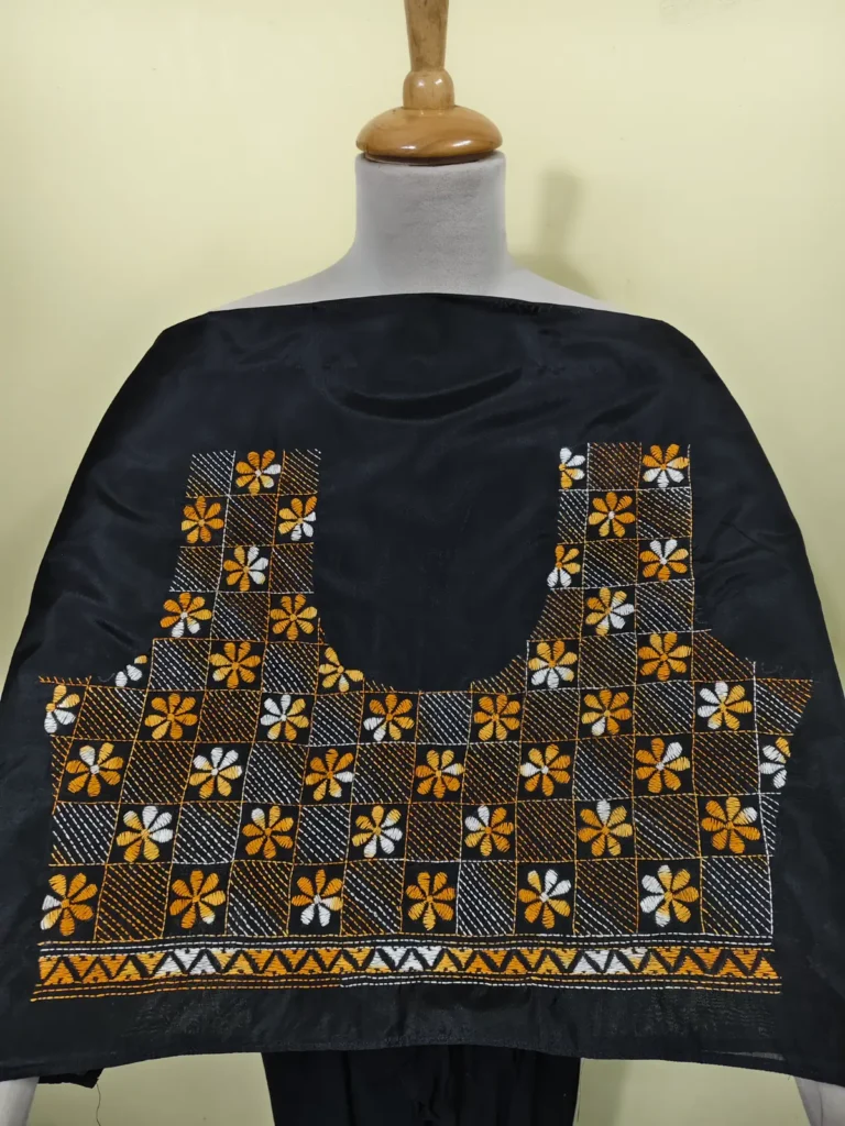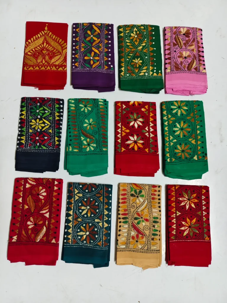 Material: Soft and warm wool fabric, often made from pure wool or wool blend. Embroidery: Delicate Kantha embroidery, hand-stitched by skilled artisans, adorns the shawl. Floral motifs in the embroidery, Weight: Medium-weight wool fabric, perfect for crisp winter mornings and cozy evenings. Feel: Soft, warm, and lightweight, with a subtle texture from the wool fabric. Occasion: Suitable for everyday wear, office or special occasions such as festivals, weddings or cultural events. Unique Features: Each Kantha wool shawl is hand-embroidered.