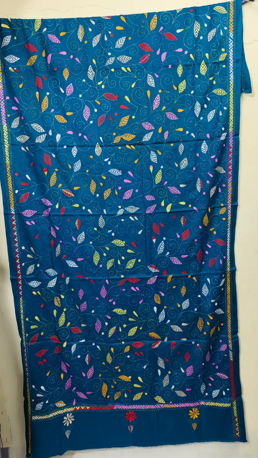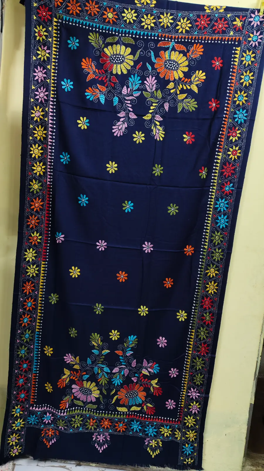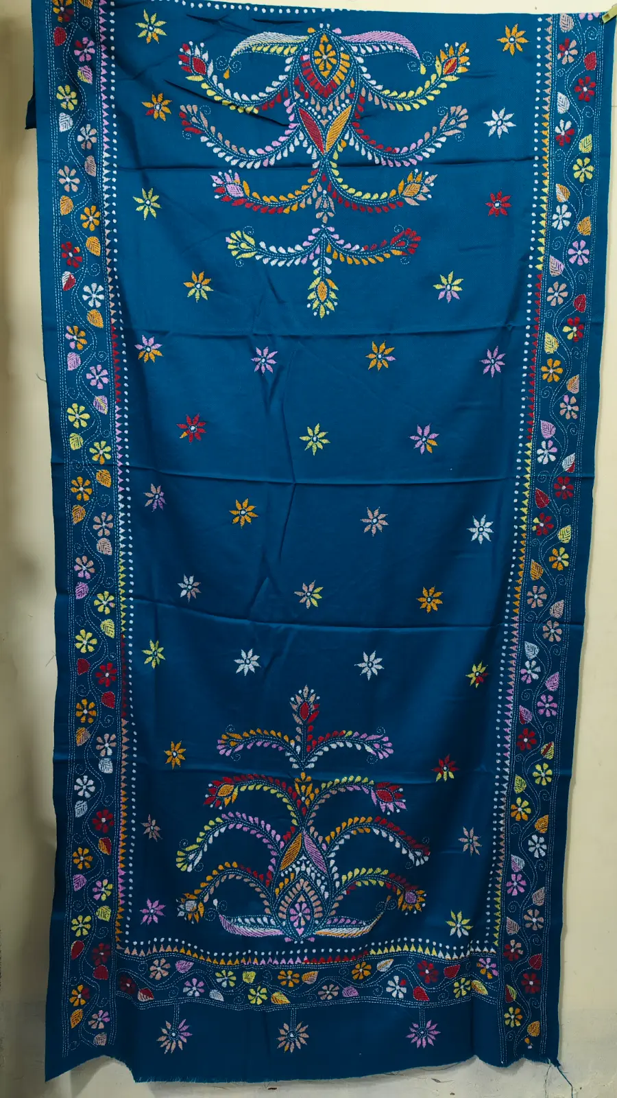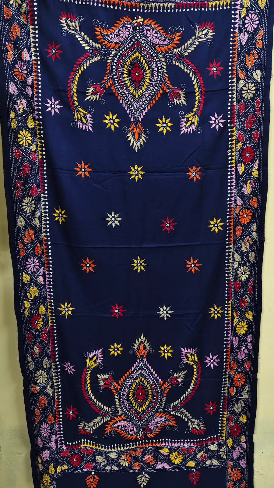 Material: Soft and warm wool fabric, often made from pure wool or wool blend. Embroidery: Delicate Kantha embroidery, hand-stitched by skilled artisans, adorns the shawl. Floral motifs in the embroidery, Weight: Medium-weight wool fabric, perfect for crisp winter mornings and cozy evenings. Feel: Soft, warm, and lightweight, with a subtle texture from the wool fabric. Occasion: Suitable for everyday wear, office or special occasions such as festivals, weddings or cultural events. Unique Features: Each Kantha wool shawl is hand-embroidered.