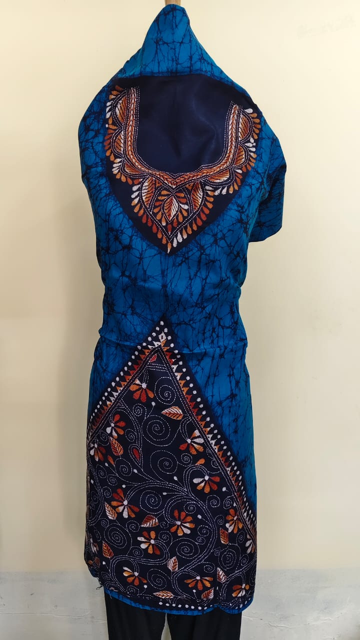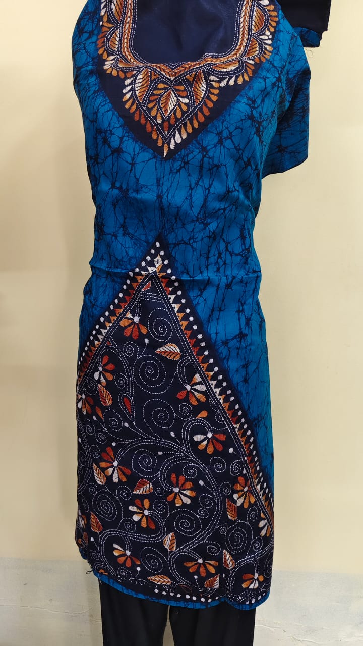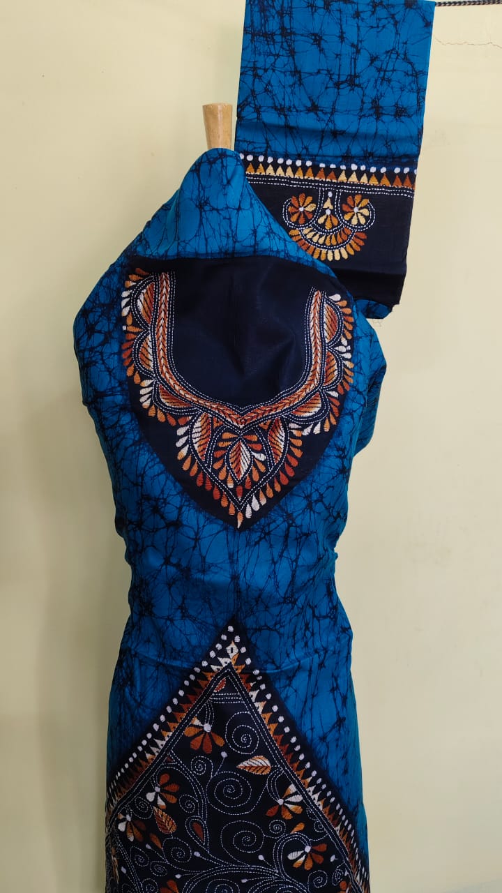 Kantha Stitch Batik 3-piece dress material set unstitched 7 meters made of 100% cotton. Top: 2.5 Meters, Bottom: 2.5M, Dupatta: 2M, Total length:- 7M, Width: 36 inches (Net Quantity 1 piece set)