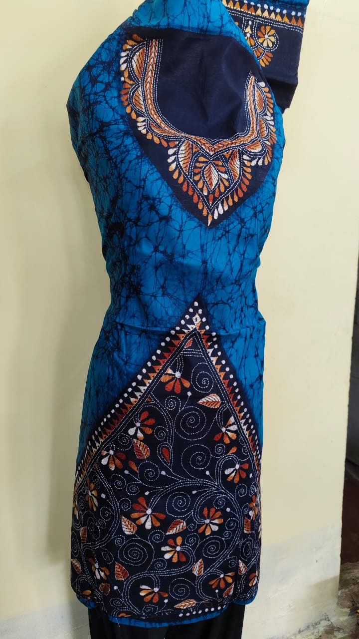 Elevate your ethnic charm with this beautifully handcrafted Kantha Stitch 3-Piece Salwar Suit Dress Material Set, designed for comfort, elegance, and versatility. This unstitched set includes a top, bottom, and dupatta made of 100% cotton, adorned with intricate Kantha stitch embroidery and traditional batik patterns.