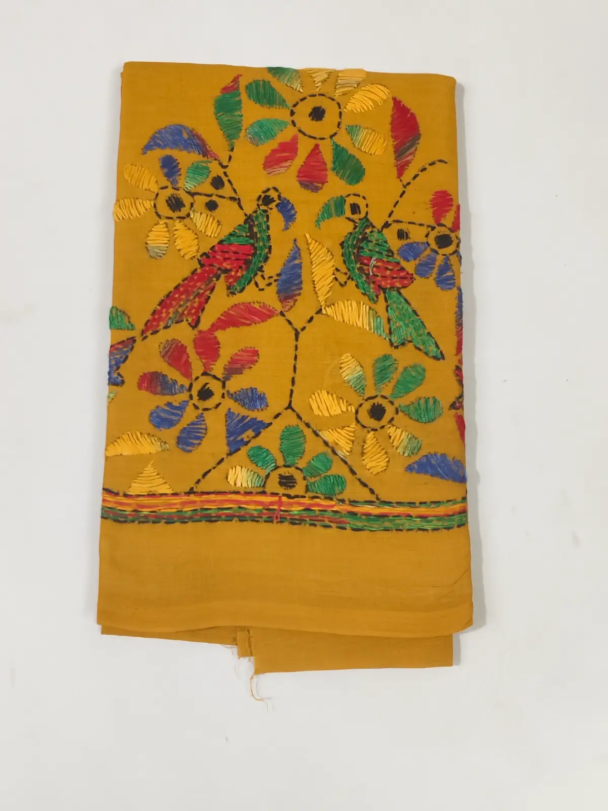 Mustard Yellow Kantha Stitch Blouse Piece – Bird motif design