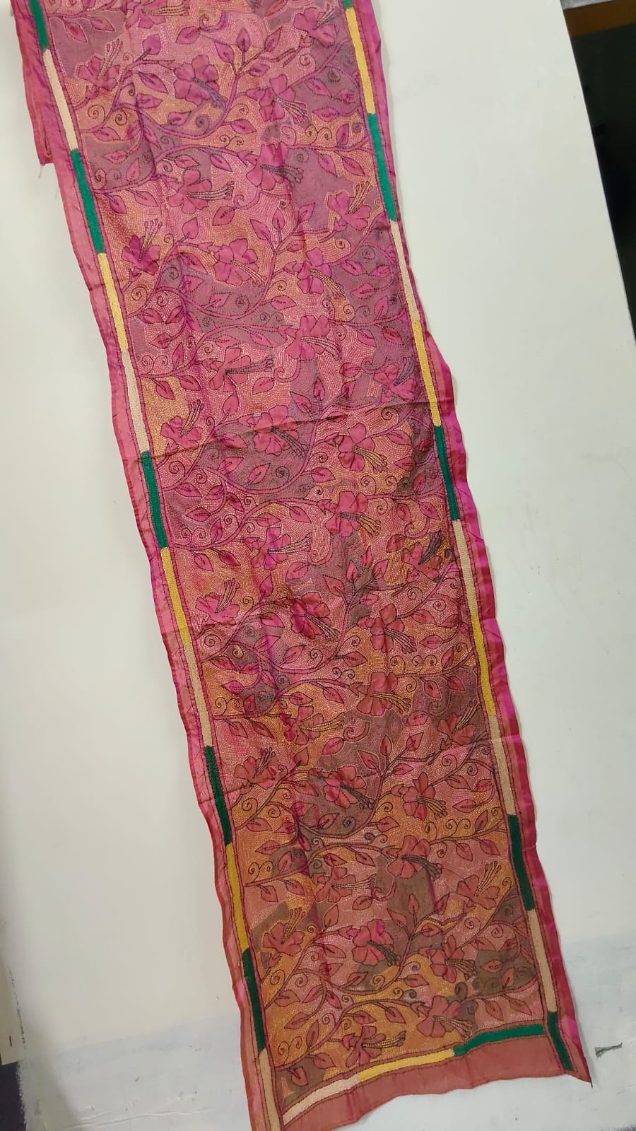 Beautiful and richly toned, this dual-shaded silk stole blends intricate Kantha stitch floral vines with orange pink color. The vibrant border featuring leaf motifs adds a festive contrast to the delicate body. Ideal for traditional occasions or to enhance simple outfits with a touch of folk artistry.