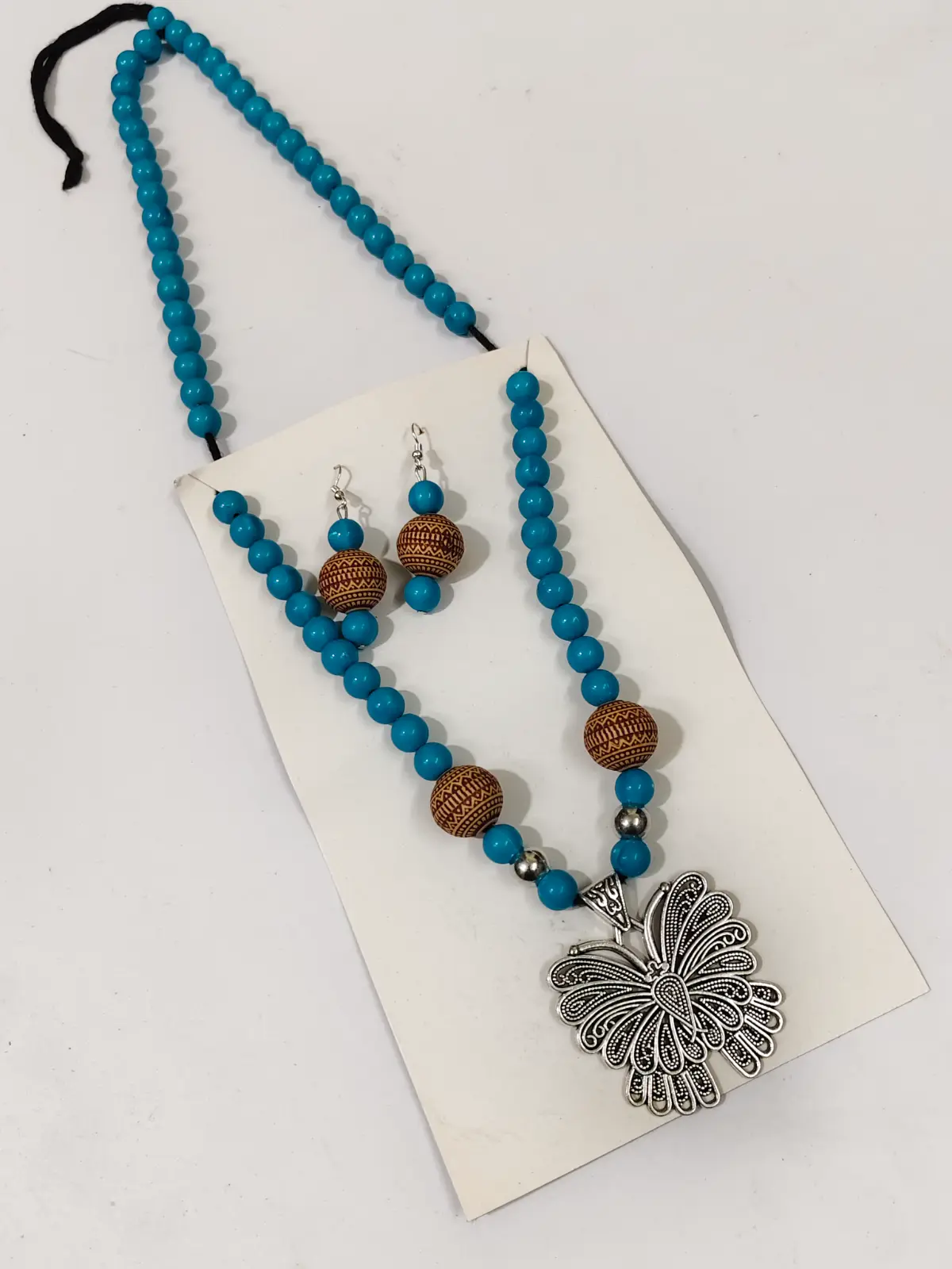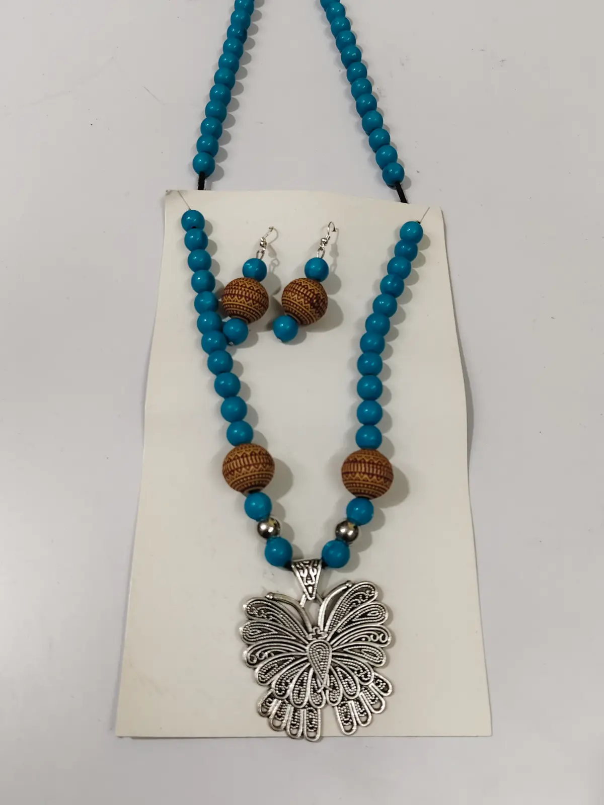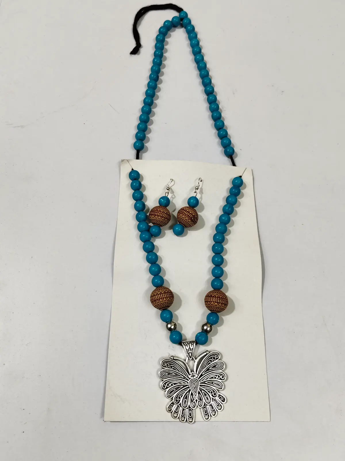This handcrafted oxidised necklace set features a striking butterfly pendant in antique silver finish paired with vibrant turquoise blue beads. Natural-style textured beads add an earthy touch, creating a beautiful blend of traditional and contemporary design. The set includes matching drop earrings that complement the necklace perfectly. Lightweight and comfortable to wear, it pairs beautifully with sarees, kurtis, or fusion outfits for festive occasions and casual ethnic styling. Each piece is artisan-crafted, making every set slightly unique. To maintain its shine, keep away from water and perfume, and store in a dry place.