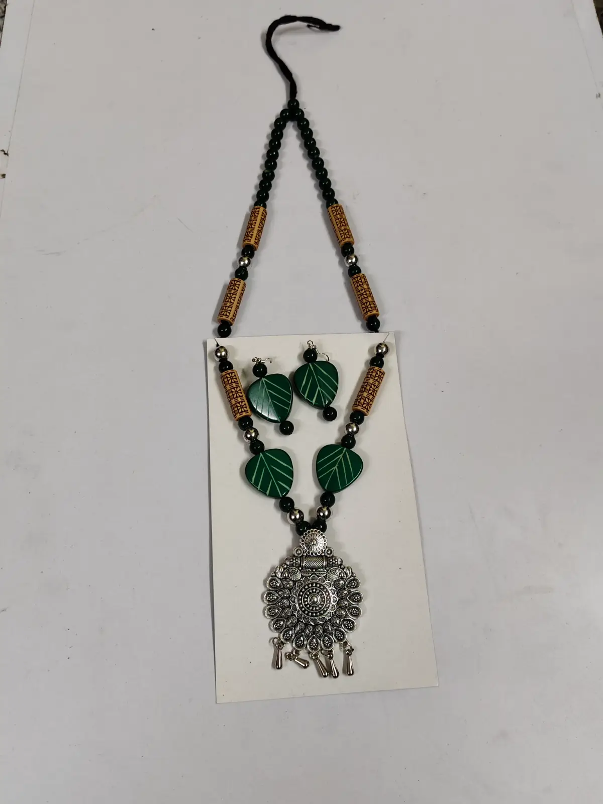 This handcrafted oxidised necklace set features a detailed tribal-style pendant in antique silver finish, beautifully paired with dark green leaf-shaped beads and carved wooden-style elements. The combination of natural textures and deep green tones creates a distinctive ethnic look. The set includes matching drop earrings that perfectly complement the necklace design. Lightweight and comfortable, it pairs well with sarees, kurtis, or other ethnic outfits for festive occasions and cultural gatherings. Each piece is artisan-made, giving every set a slightly unique character. To maintain its finish, keep away from water and perfume, and store in a dry place.