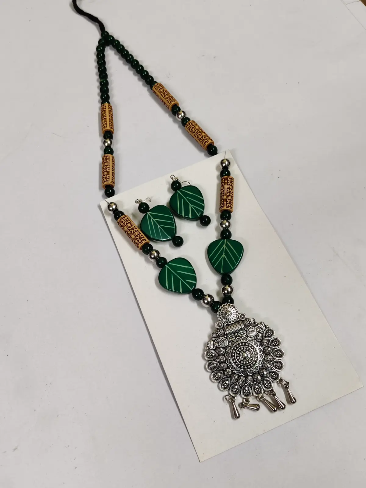Oxidised Tribal Pendant Necklace Set with Green Leaf Beads & Earrings