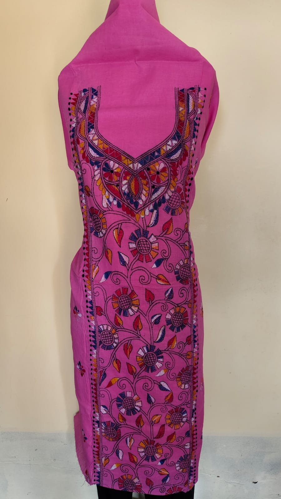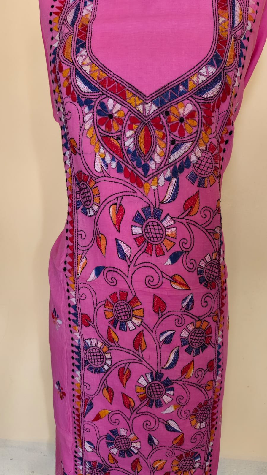 Pink Unstitched Cotton Bengal Kantha Handwork Long Kurta Material